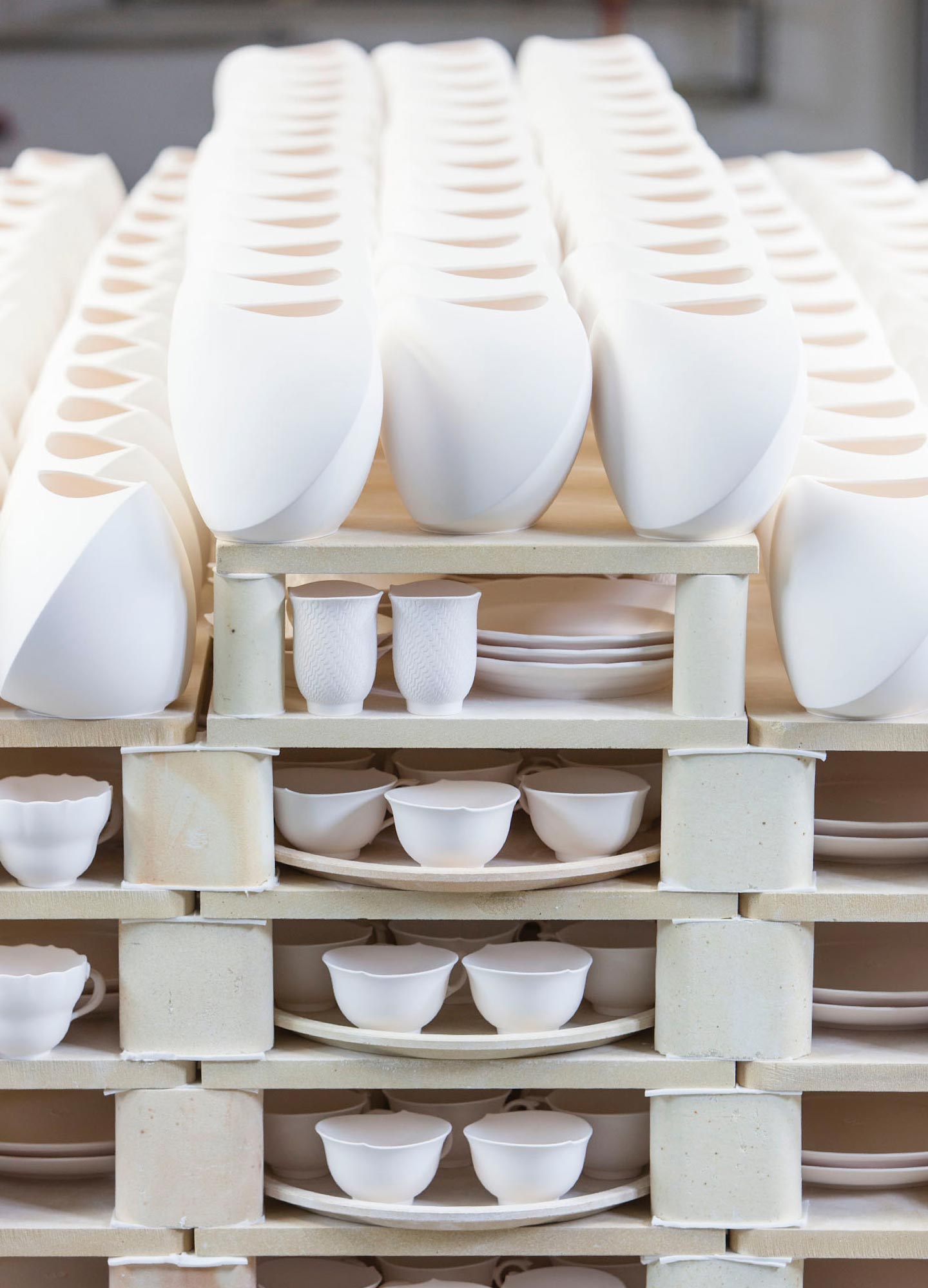 GlühbrandNeben der Zusammensetzung der Grundmasse sind es wesentliche Fortschritte in der Brenntechnik, die Anfang des 18. Jahrhunderts in Meissen die Entdeckung des Porzellans ermöglichen. Hunderte Stunden verbringen Porzellanobjekte bei verschiedenen Hitzegraden in den Öfen. Ihre Feuertaufe erhalten die Porzellane direkt nach dem Trocknen beim ersten sogenannten Glühbrand. Bei Temperaturen von 950° C festigt sich hier die Struktur des Porzellans zu einem porösen, saugfähigen Scherben. Alle Unterglasurmalerei sowie das Schwertern aller Meissener Porzellane findet direkt auf diesen verglühten Rohlingen statt. -