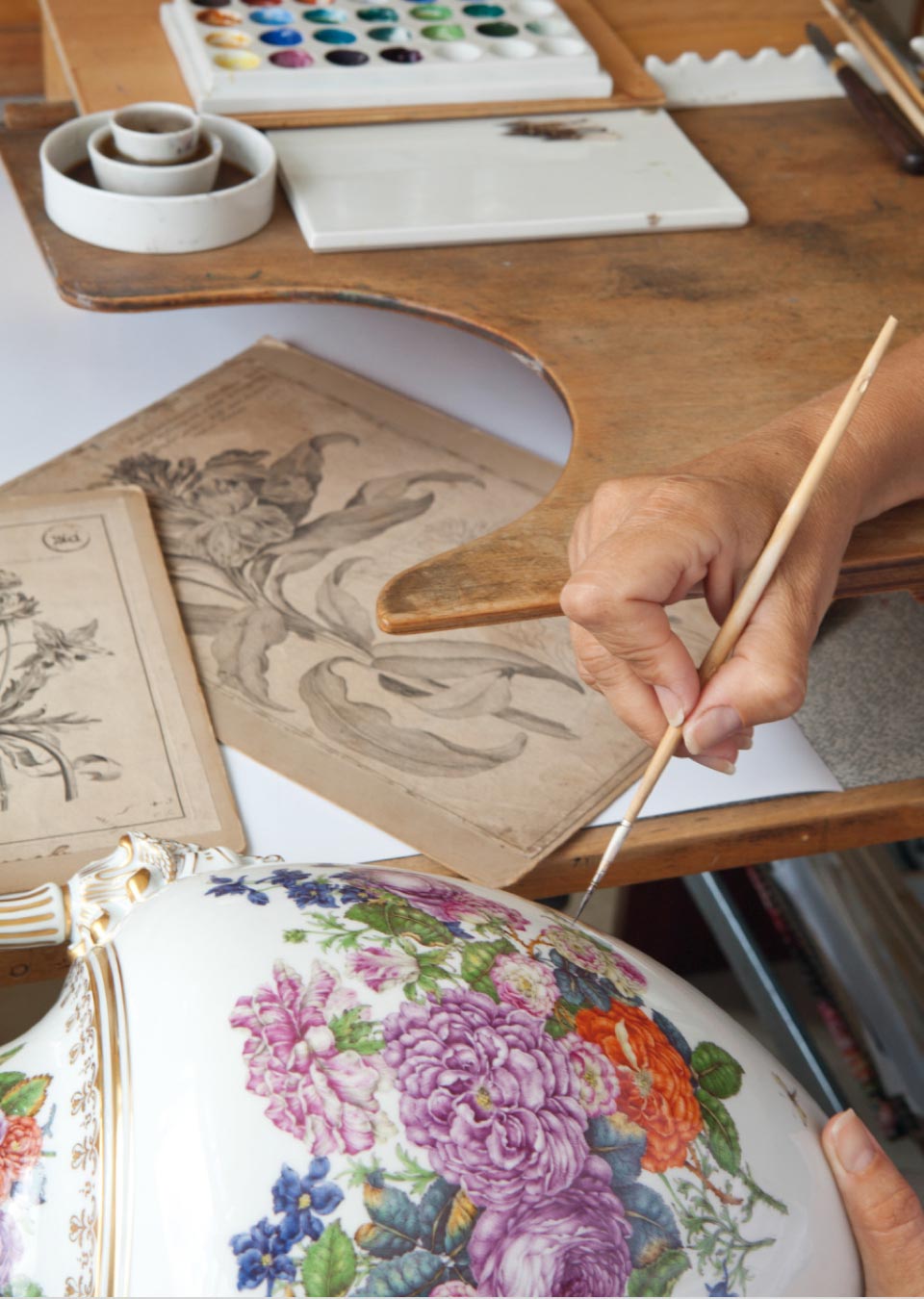 FarblaborSeit 1720 besitzt die Manufaktur Meissen ein eigenes Farblabor, in dem alle Auf- und Unterglasurfarben selbst hergestellt werden. In ihrer Anfangszeit ist es der Porzellanmaler Johann Gregorius Höroldt, der die Farbentwicklung der ersten Porzellanmanufaktur Europas vorantreibt. Die Höroldt‘sche Grundpalette beträgt 16 feuerfeste Aufglasurfarben sowie die Unterglasurfarbe Kobaltblau, die bis heute für das Schwertern des Meissener Porzellans verwendet wird. Rund 300 Farben zählen heute zum Standardrepertoire der Meissener Porzellanmaler. Ein kleiner Teil der etwa 10.000 Farbrezepturen, die das manufaktureigene Farblabor bewahrt, um jede Nuance historischer Meissener Porzellanfarben wieder aufbereiten zu können. Ihre genaue Zusammensetzung ist bis heute ein gut gehütetes Geheimnis und nur wenigen Mitarbeitern zugänglich. -