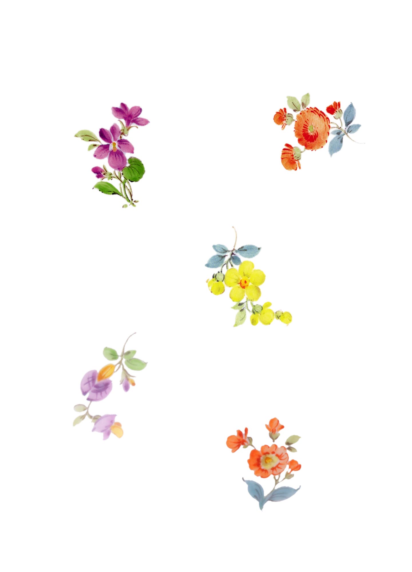 „Gestreute Blümchen“ gehört zu den beliebtesten Dekoren der Manufaktur Meissen. Anfang des 19. Jahrhunderts entstanden, ist er eine typische Schöpfung des Biedermeier. Blüten und Blumen sollen in ihrer natürlichen Schönheit gezeigt werden und sich damit erstmals von den ‘indianischen’ nach ostasiatischen Vorbildern absetzen. Als besondere Spielart der Manierblumenmalerei, besitzt der Meissener Dekor eigene Merkmale. Eine vergrößerte Mittelblume wird von mehreren vielgestaltig variierten kleineren Blumen umstreut. Die Porzellanmaler können hierfür auf drei Dutzend Blumenmotive zurückgreifen – jedes mit eigener Symbolik, die zu Zeiten des Biedermeier verwendet wird, um Gedanken und Empfindungen auszudrücken. En Detail per Hand auf Porzellan gemalt, verleihen die „Gestreuten Blümchen“ eine besondere Lebendigkeit und innere Symbolik.
