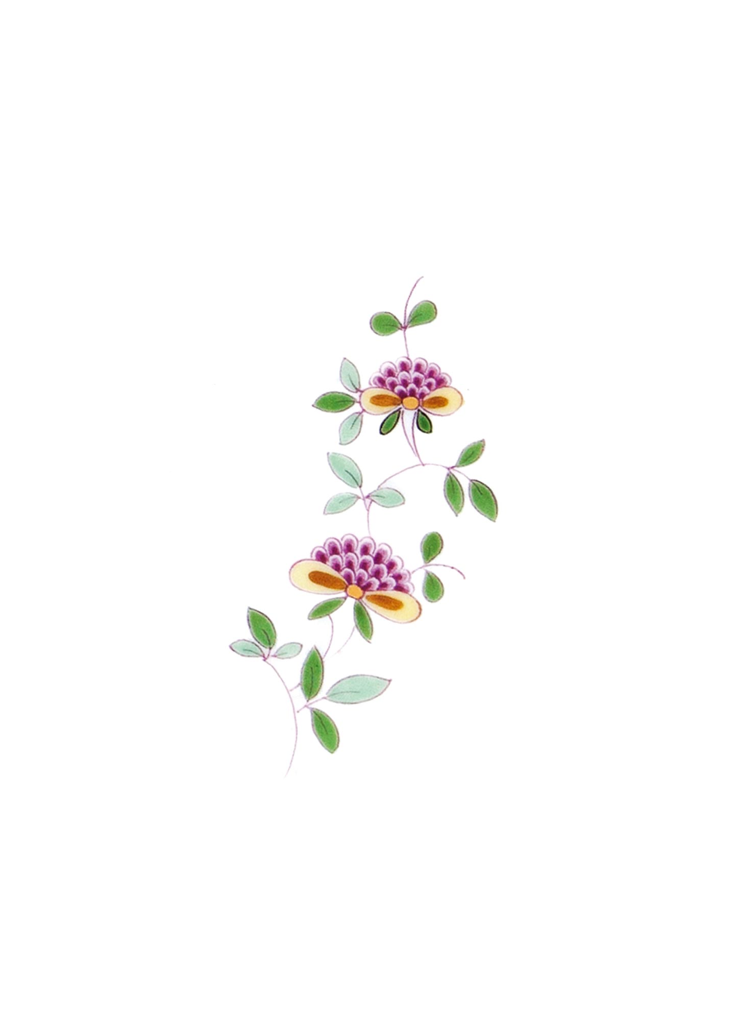 Die „Indischen Blumenzweige“ gehören zu den ältesten Dekoren der Manufaktur Meissen. Sie werden bereits 1720 zur Zier von Tafelgeschirr und Vasen verwendet. Der „indianischen“ Blumenmalerei nach ostasiatischen Vorbildern nachempfunden, stecken sie voller Symbolkraft. In ihr nimmt der Lotus als Zeichen der Reinheit und Erleuchtung eine besondere Stellung ein. Aus schlammigem Grund gewachsen, erstrahlt er rein und unbefleckt in voller Blüte – ein Sinnbild, dessen metaphorischer Gehalt ebenso auf das Meissener Porzellan übertragen werden könnte.