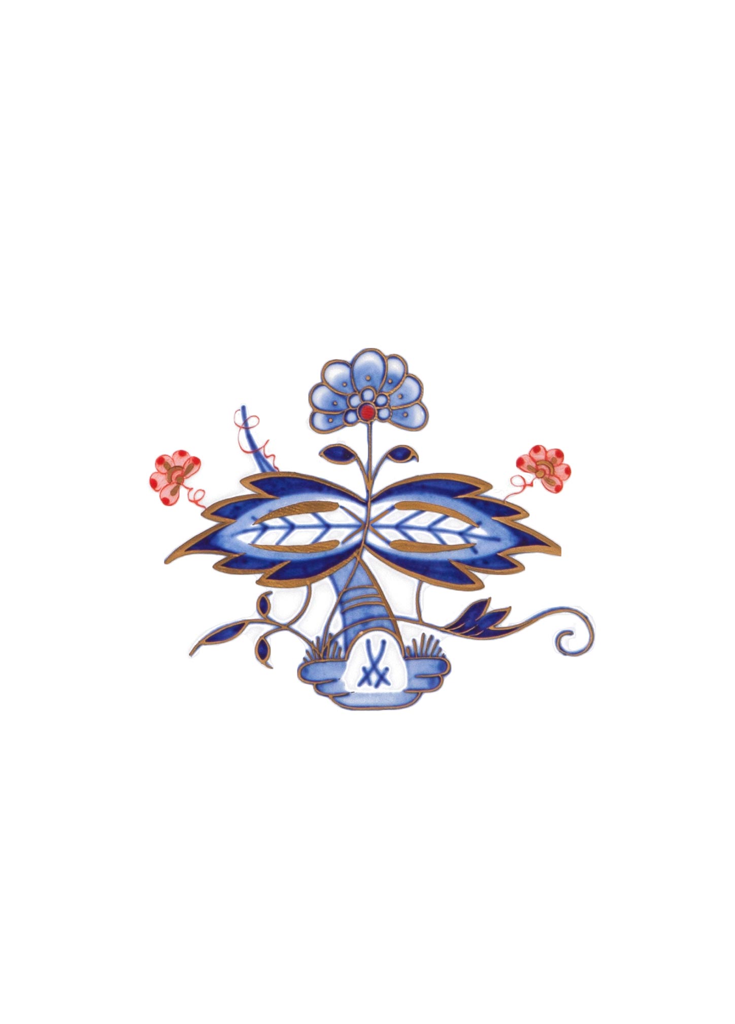 Inspiriert von damals überwiegend blau gestalteten ostasiatischen Porzellanen entsteht 1731 in Meissen das weltbekannte „Zwiebelmuster”, der ikonischste Blaudekor der Porzellangeschichte. Tatsächlich stellt der Dekor keine Zwiebeln dar, sondern zeigt in Anlehnung an seine Vorbilder Pfirsich und Melone auf dem Tellerrand sowie Bambusstock und die zarten Blüten der Chrysantheme in der Mitte. In “Noble Blue” findet das „Zwiebelmuster” eine neue Gestalt, die der Opulenz des Originaldekors moderne Leichtigkeit entgegensetzt. Charakteristisch für den Dekor ist die Verwendung des manufaktureigenen Kobaltblaus. Motivische Details in leuchtendem Rot sowie filigrane Goldveredelungen ergänzen schließlich die Farbpalette von „Noble Blue“ und inszenieren das Blau in komplementären Kontrasten.