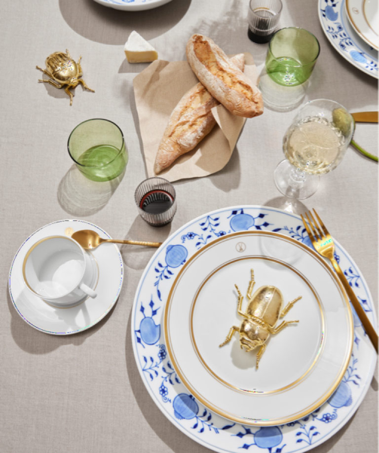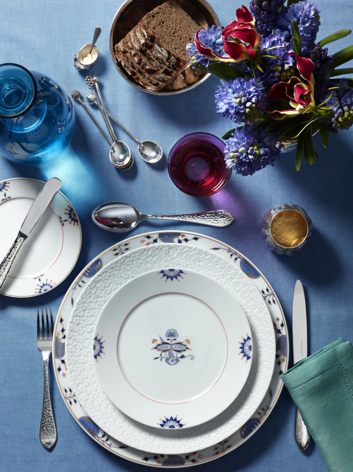 • Aufgrund ihres großen Erfahrungsschatzes in der „Indisch“- und Goldmalerei erhielt Andrea Mai schließlich auch die Möglichkeit, auf der neuen Serviceform „N°41“ das neu entwickelte Dekor „Noble Blue“ malerisch umzusetzen. Die Entscheidung war naheliegend, da das „Zwiebelmuster“ als ostasiatischer Dekor aus der „Indischmalerei“ stammt und als Inspiration für die moderne Umsetzung auf der Form „N°41“ diente.