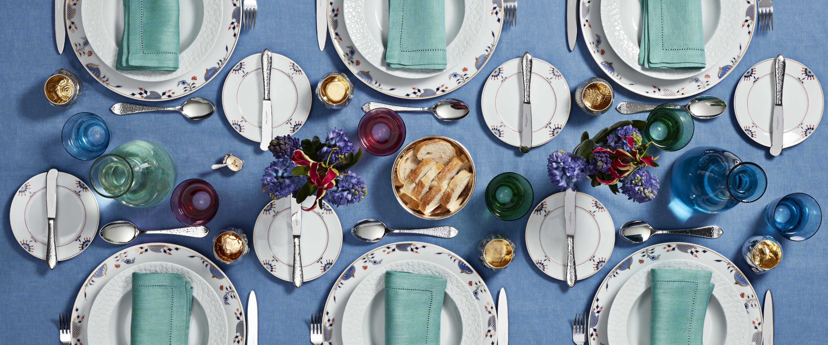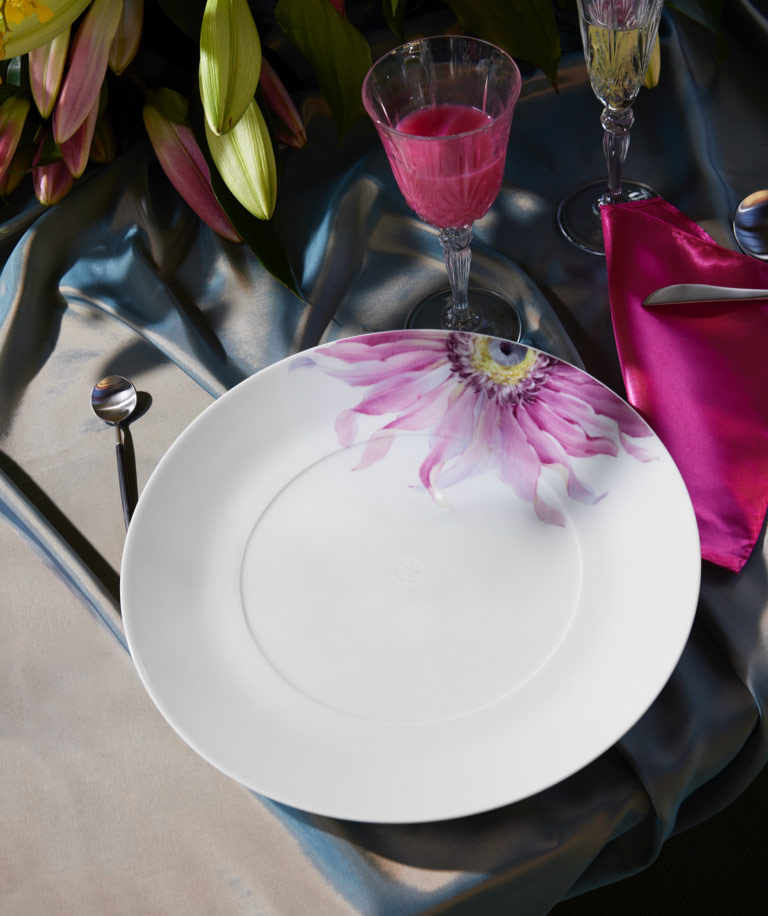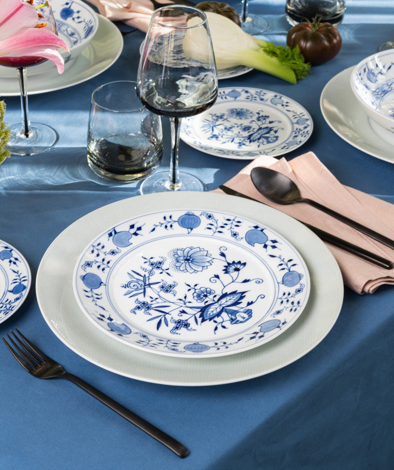 Besonders gefallen der Porzellanmalerin an „Noble Blue“ die verschiedenen Kombinationsmöglichkeiten innerhalb des Services oder auch mit bereits bestehenden Porzellanen. So ergeben sich aufgrund der verschiedenen Anordnungen der Ornamente auf Platz-, Speise- oder Dessertteller immer wieder neue Arrangements. Zugleich begeistert die Künstlerin der modern zeitlose Stil des Dekors sehr, das durch seine Unter- und Inglasurmalerei spülmaschinengeeignet und so sehr gut im Alltag zu verwenden ist.