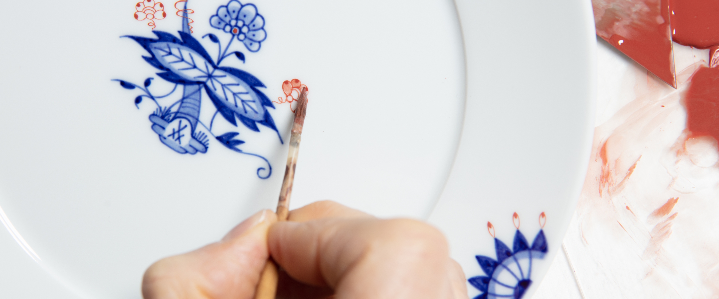 Bereits im ersten Ausbildungsjahr in der Zeichenschule entdeckte die Porzellanmalerin Ihre Liebe zur „Indischmalerei“. Diese Malerei ist inspiriert von den historischen ostasiatischen Dekoren und spiegelt sich beispielsweise in den Dekoren „Ming-Drache“ oder auch dem „Zwiebelmuster“ wider. Auch diesen Traum konnte sich die Künstlerin erfüllen.
