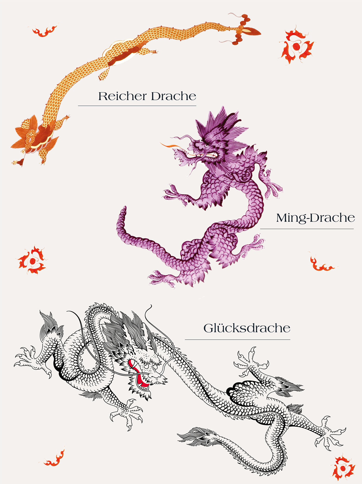 Im Gegensatz zum Reichen Drachen hatte man bei der Entwicklung des Ming-Drachen-Dekors keine konkreten Vorlagen zur Hand, an denen man sich exakt orientieren konnte. Stattdessen musste man auf Überlieferungen zurückgreifen, ohne die tiefen Symboliken hinter den kleinen Details zu kennen. Um dies zu beheben und die Kultur hinter dem Drachen zu ehren, widmete sich unsere Produktdesignerin Zhuoyu Hou, deren Wurzeln bis hin zu einem kleinen Dorf im Süden Chinas zurückführen, der Gestaltung eines echten (kaiserlichen) Drachens. So entstand im Jahr 2022 der neue „Glücksdrache“, der sich erheblich von seinem Vorgänger unterscheidet – beispielsweise durch eine Zunge, die nicht herausgestreckt wird, ein Schwanzende mit Haaren und vor allem Gliedmaßen mit fünf Krallen.