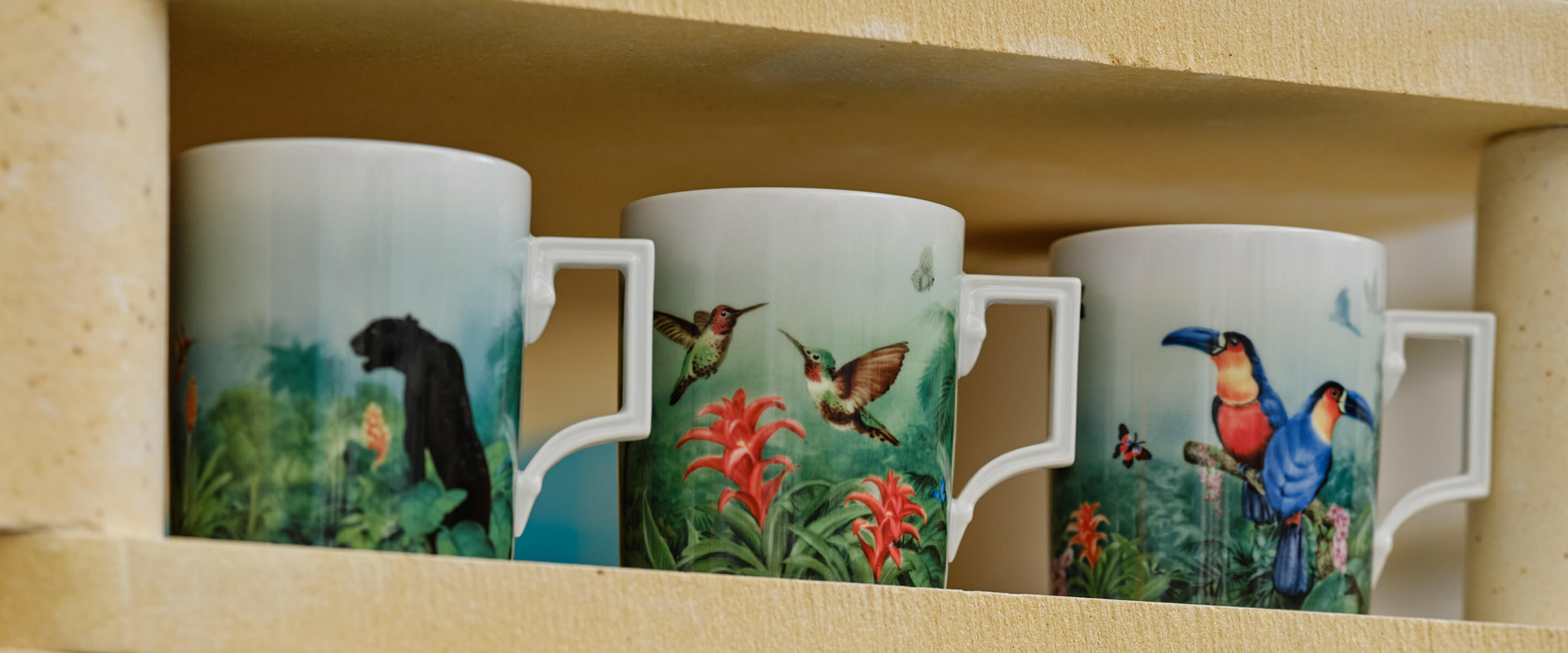 fünf einzigartige Mugs mit den Motiven der Wandbilder und der Vase „Amazonas“ erweitert. Eines der Motive, der schwarze Panther, wurde exklusiv für diese Henkelbecher-Kollektion gemalt. Dieser Bewohner des Regenwaldes ist eigentlich ein Jaguar mit durchgehend schwarzer Fellfärbung – wobei die Bezeichnung auch auf Leoparden mit dieser Eigenschaft zutrifft. Majestätisch fügt sich das Raubtier in die Szenerie ein.