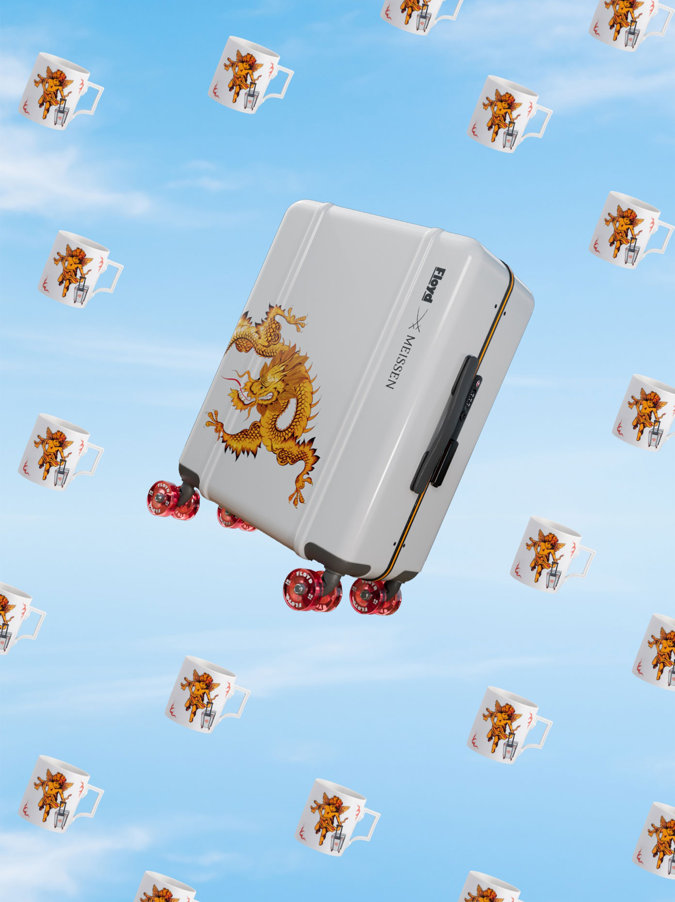 Entstanden ist ein Floyd x Meissen Travel Case on Wheels, verziert mit dem weltbekannten Meissener Ming-Drachen, der zu den berühmtesten und ältesten Dekoren von MEISSEN zählt. Dazu passend gibt es einen Porzellan-Mug mit den Brands beider Marken. Diesen ziert ein pausbäckiger Barockengel im Putto-Stil, der mit einem Floyd x Meissen-Koffer auf Reisen geht und Sie als Ihr ganz persönlicher Schutzengel auf Ihren Trips begleitet. Natürlich ist die Floyd x Meissen-Sammleredition streng limitiert. Insgesamt werden nur 500 Sets hergestellt, die ab November in den Verkauf gehen.