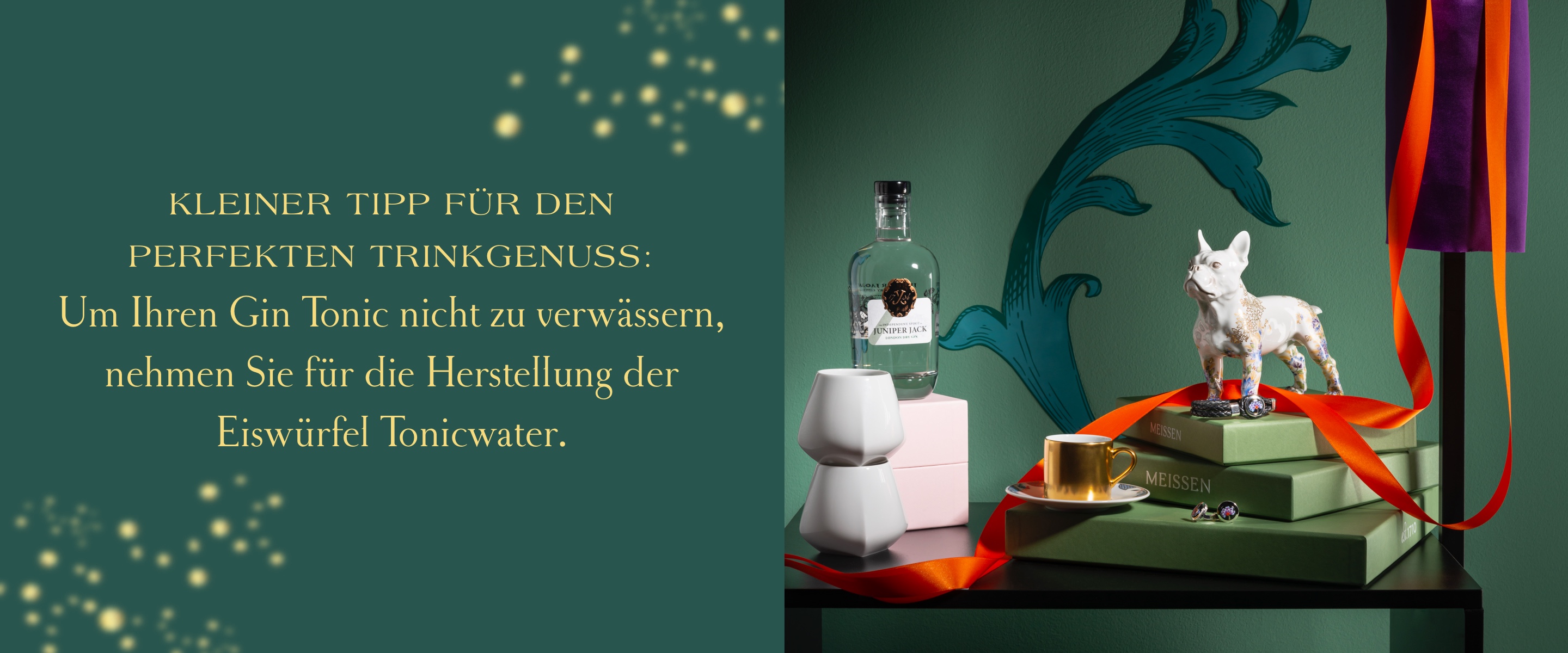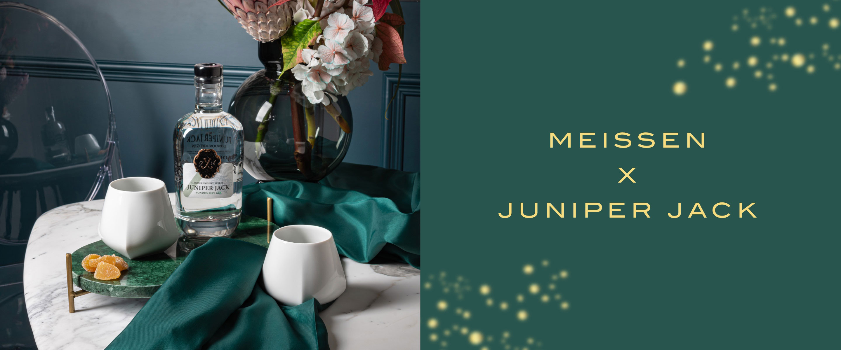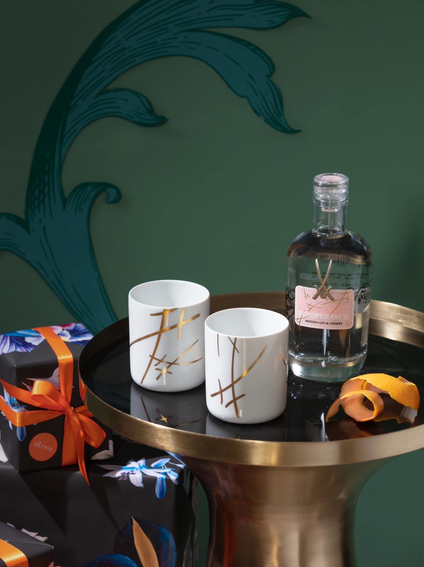Mit dem neuen exklusiven Geschenkset von MEISSEN X JUNIPER JACK geht die Kooperation der beiden sächsischen Marken in die nächste Runde. Dieses Jahr präsentieren sich die Unternehmen mit einem gemeinsamen Juniper Jack Meissen Gin & Cherry - einem London Dry Gin mit edler Kirschnote. Die gekreuzten Schwerter, das unverkennbare Markenzeichen der Meissener Porzellanmanufaktur, zieren dabei nicht nur das Etikett der Flasche, sondern auch die modernen Gin-Becher aus feinstem Meissener Porzellan. Sie sind Teil der „Swords”-Kollektion, mit der das geschichtsträchtige Signet als eigenständiges Dekor in schimmerndem Gold inszeniert wird. Die Gin-Becher mit einem Füllvolumen von 0,15l sind in ihrer Form den klassischen Tumblern nachempfunden – haptisch ansprechend und groß genug um mehrere Eiswürfel aufnehmen zu können. Zugleich hält das Material Porzellan Ihren Gin schön kühl und frisch.
