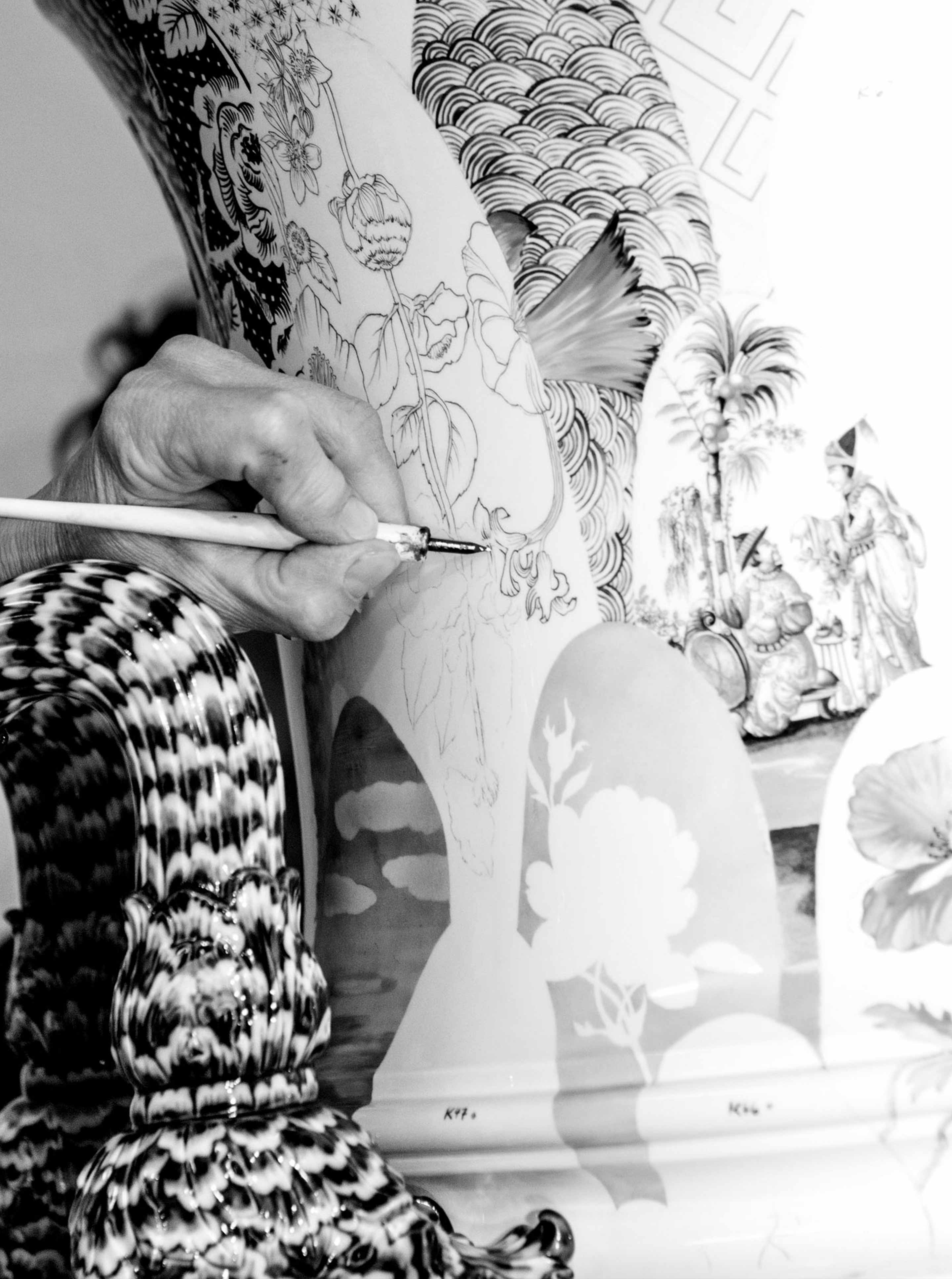 Vor ihrem zweiten Brand wird die Kratervase glasiert, ein Arbeitsschritt, der die Unterglasurmalerei samt der Gekreuzten Schwerter schützt und das berühmte Strahlen des „weißen Goldes“ hervorbringt. Weitere Farben werden nun direkt auf der Glasur des glatt gebrannten Porzellans aufgemalt. Auch hier widmet man sich getrennt dem Sockel und dem Körper der Vase. Unter den vielen Dekoren finden sich berühmte Ikonen der über 300-jährigen Manufakturgeschichte: „1001 Nacht“ von Prof. Heinz Werner, zahlreiche von Kupferstichen inspirierte Blumenmotive und der wahrhaft ikonische „Ming Drache“. Zu den letzten Arbeitsschritten zählt der Dekorbrand: bei 900 °C in einem elektrischen Brennofen verbinden sich die verschiedenen Aufglasurfarben mit der Unterglasur. Fast drei Wochen dauert es, bis sich die verschiedenen Farbschichten langsam in das Porzellan eingebrannt haben und ihre strahlende Leuchtkraft erreichen.