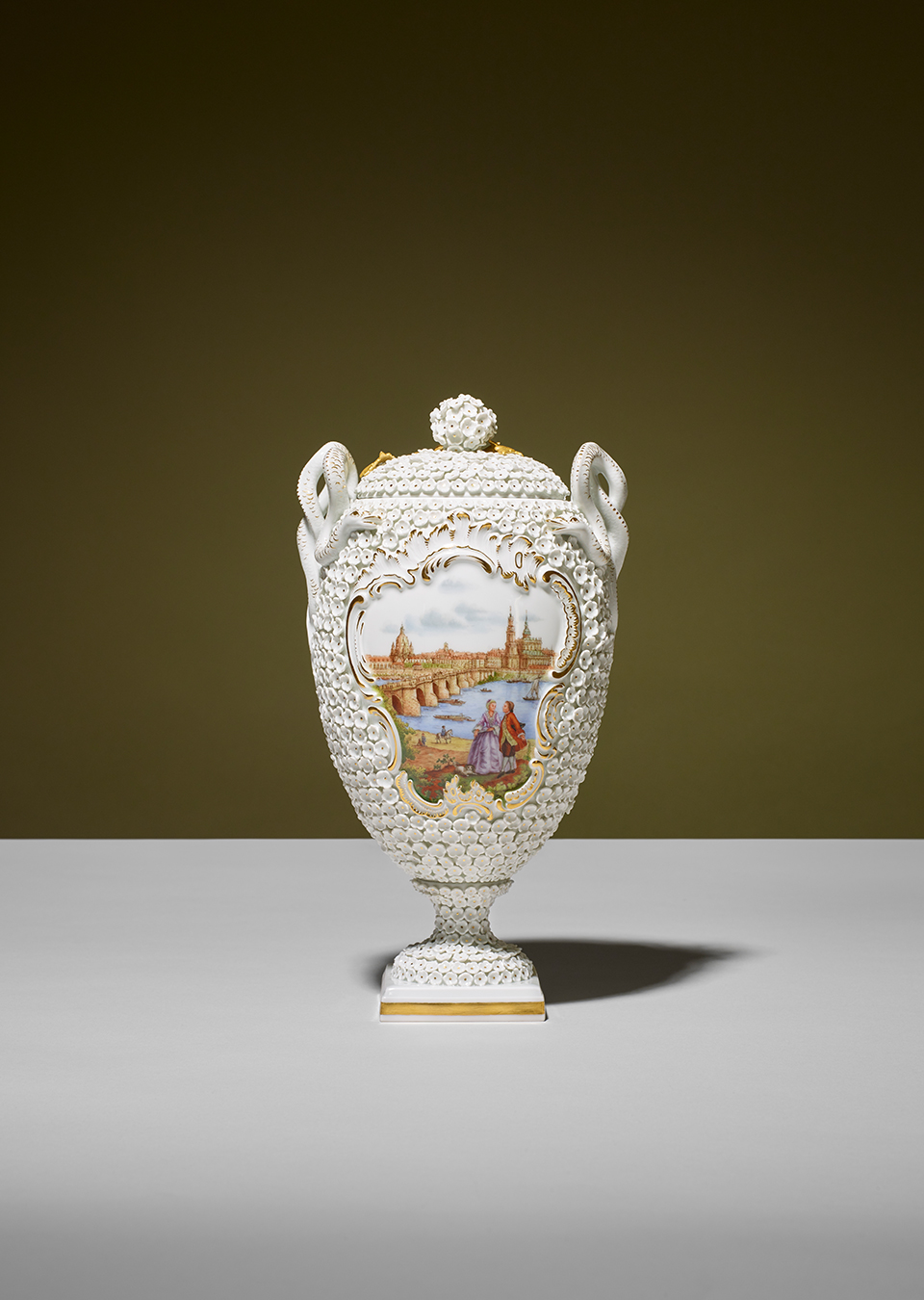 Sie ist ein in wahrhaftiges Meisterwerk: eine opulent verzierte Vase, auf der über 100 Meissener Dekormotive von 27 spezialisierten Malern in unterschiedlichen Techniken umgesetzt wurden. Die originale Form, 1856 von Ernst August Leuteritz entworfen, war mehr als 80 cm hoch und Höhepunkt auf der Londoner Weltausstellung 1862. Als Reise durch die Meissener Dekorgeschichte wurde die Vase nun wieder aufgelegt. Ausgangspunkt bildet eine detailreiche Unterglasurmalerei, gefolgt von einer beeindruckenden Bandbreite an Dekoren aus allen Manufakturepochen, deren Zusammenspiel in 233 Ausschnitten einen Ehrfurcht gebietenden Eindruck hinterlassen.