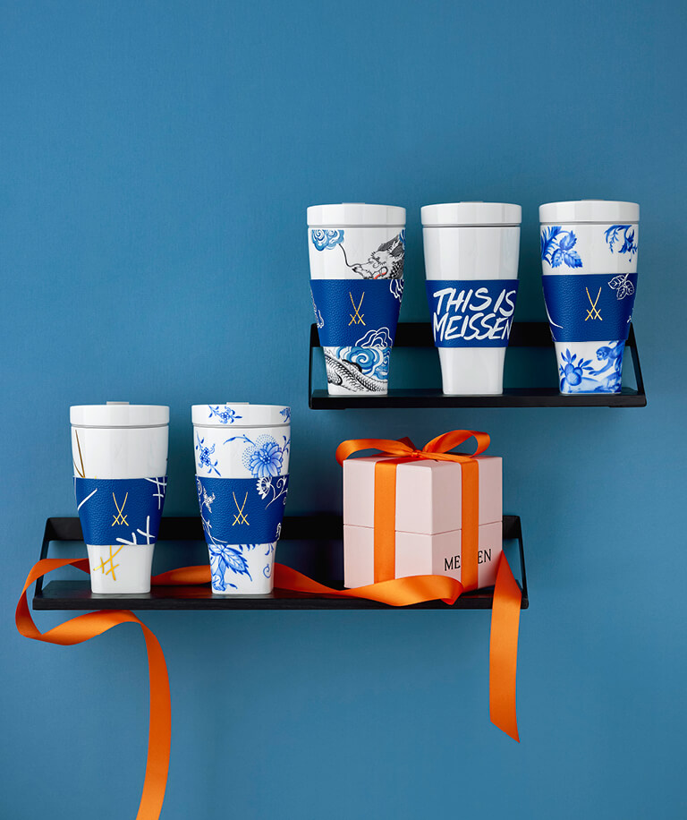 Eines der ersten Dekore, die die Produktdesignerin für den Coffee-to-Go-Becher im Sinn hatte, war das Motiv "Affe & Faultier". Als Inspirationsquelle diente dabei ein bemerkenswertes Stück aus der Geschichte von MEISSEN – eine Vase, auf der die Tiere in blauer Unterglasur dargestellt sind. Die Szene, in der die Tiere an den Bäumen hängen, weckte bei der Produktdesignerin Hou Assoziationen von Erschöpfung, Müdigkeit und dem dringenden Bedürfnis nach Kaffee. Weitere ikonische Dekore, wie das Zwiebelmuster in klassischem Blau oder die Gekreuzten Schwerter in Gold folgten. Anlässlich des bevorstehenden Jahr des Drachens wurde zudem eine Variante mit dem von Hou gestalteten Glücksdrachen vorgesehen.