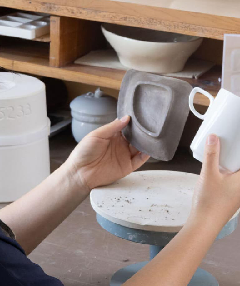 Von Anfang an war klar, dass auch der Deckel aus Porzellan gefertigt sein sollte. Dies stellte in der Produktionsphase zunächst eine Herausforderung dar. Porzellan neigt aufgrund seiner chemischen Zusammensetzung während des Brennvorgangs dazu, subtile Variationen und Unregelmäßigkeiten aufzuweisen. Diese Unvorhersehbarkeit im Schrumpfungsprozess erschwerte die exakte Passung der Teile, insbesondere wenn eine enge Verbindung zwischen Deckel und Becher erforderlich war. Doch durch rasche Anpassungen in unseren Fertigungsprozessen haben wir diese Hürden überwunden. Somit kann heute jedem Becher ein passgenauer Deckel zugeordnet werden.