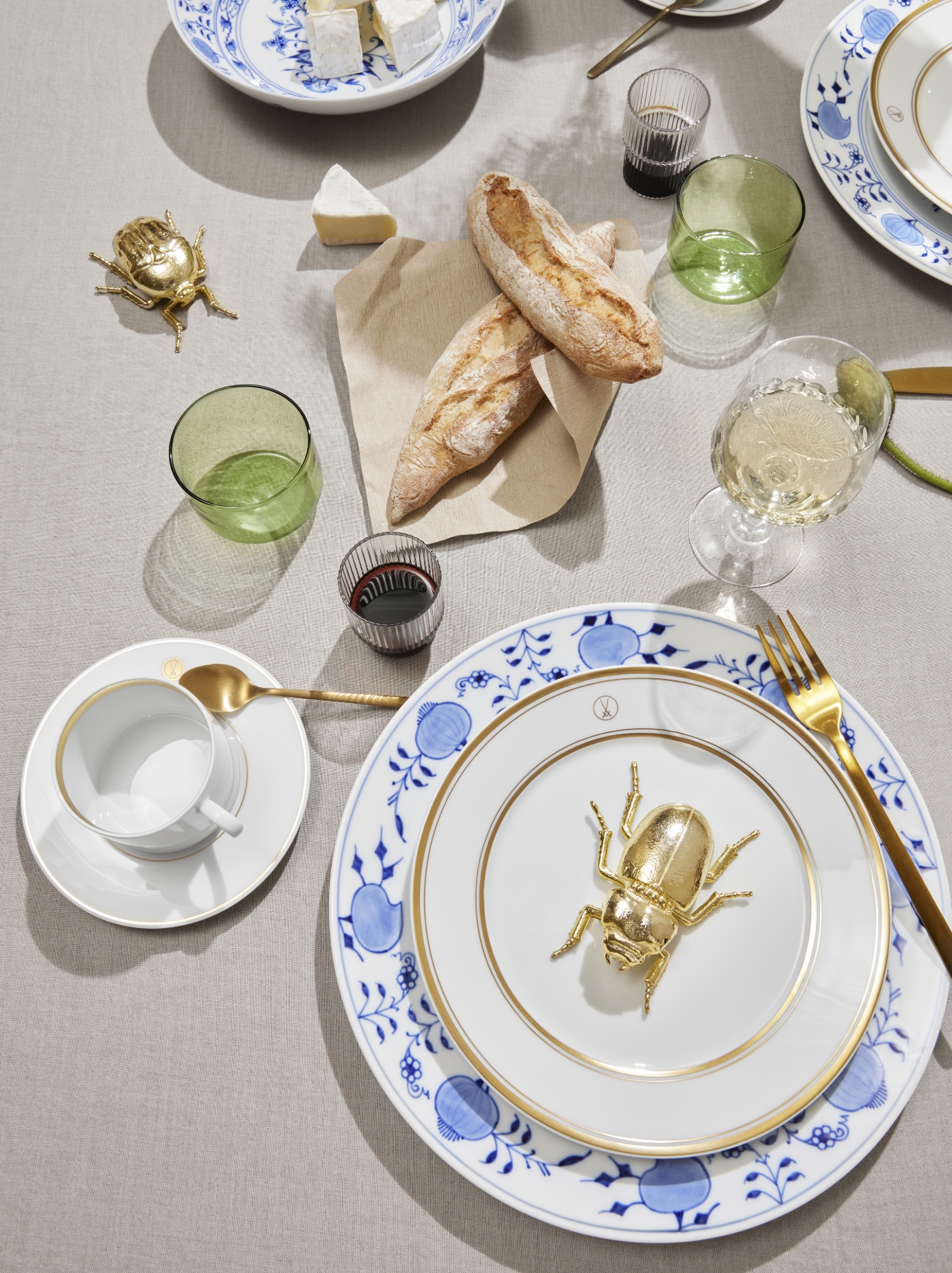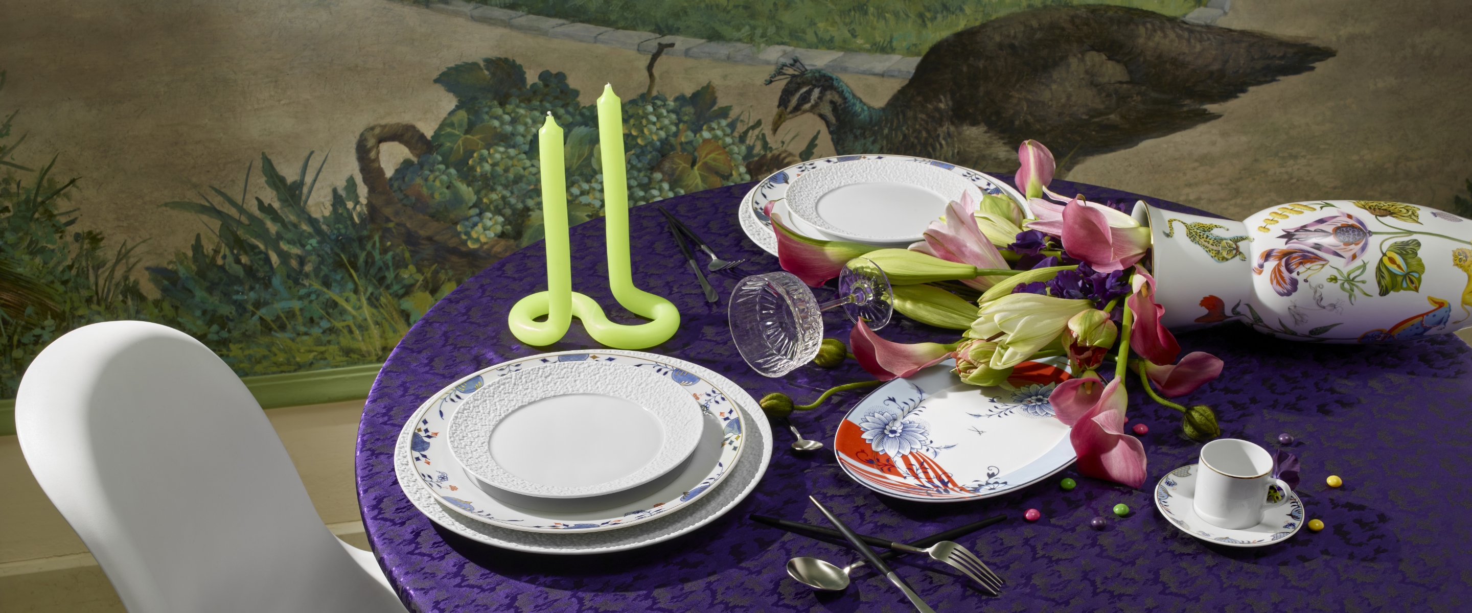 Mixen Sie ganz bewusst die verschiedenen Stilrichtungen und bringen Sie Ihre historischen Erbstücke auf den Tisch. Dem historischen „Zwiebelmuster“ verleihen Sie neuen Glanz mit Porzellanen unserer „N°41 Paradise Birds Blush“ Kollektion. Die farblichen Akzente in Grün oder Rosa bringen Lebendigkeit und Frische auf den gedeckten Tisch. Zugleich umrahmen sie das ikonische Blau des Zwiebelmusters und heben es auf besondere Weise hervor. Wer es noch ein Stück farbenfroher mag, der kombiniert zum Zwiebelmuster die „Bloomy Feathers“ Porzellane aus unserer „THE MEISSEN COLLAGE“ Serie. Das Dekor kombiniert die unverwechselbaren Elemente des Originals in zartem Blau mit kräftigen Rottönen der markanten Feder. Die farblichen Kontraste sorgen für eine aufregende Verbindung, die den einzigartigen Charakter des Zwiebelmusters in neuem Glanz erstrahlen lässt. Kombinieren Sie auch unsere Weiß-Porzellane wie das zauberhafte „Royal Blossom“ mit auffälligen Farben oder Mustern. Besonders geschätzt ist hierbei die Verbindung mit dem eleganten „Noble Blue”. Mit seinen farbigen Akzenten in Rot und Gold verjüngt das Dekor das berühmte „Zwiebelmuster“ und verleiht dem Service zugleich Eleganz. In Verbindung mit dem romantischen Schneeballblütendekor auf dem „Royal Blossom“ Service, das dem Ensemble eine verspielte Struktur verleiht, kreieren Sie einen edlen Look für Ihre Tafel. Diese Harmonie und bezaubernde Romantik, die in diesem Arrangement mitschwingt, macht es so beliebt für die Hochzeitstafel. Lassen Sie bei weißen Porzellanen auch verschiedene Haptik in Ihre Arrangements einfließen. Das „Wellenspiel Relief“ wie auch die „Royal Blossom“ Porzellane gibt es in glasiert und Biskuit. Wählen Sie zum Beispiel einen Platzteller aus Biskuit-Porzellan und einen glasierten Speiseteller, das sorgt für Abwechslung und Spannung auf der Tafel. Denn in dem Biskuit Porzellan bricht das Licht anders als bei den glasierten Varianten, was für ein einzigartiges Licht-Schattenspiel sorgt. Zudem ist es ein Erlebnis für die Sinne, die unterschiedliche Haptik zu sehen und zu fühlen. Auch Porzellane mit barocken Dekoren wie unser „Schwanenservice“ können hervorragend mit einer anderen Stilrichtung ins Hier und Jetzt geholt werden. Das Dekor „Noble Chinese“ unserer „MEISSEN COLLAGE“ Kollektion vereint die frühere fantasievolle Darstellung der europäisch geprägten Vorstellung vom Reich der Mitte mit geradlinigen Mustern und Pastelltönen. Diese Kombination ist ein absoluter Blickfang und schafft es, zwei historische Dekore in moderner Opulenz miteinander zu vereinen, wie sie sonst nie in Erscheinung getreten wären. Leben Sie Ihre Individualität aus und schaffen Sie Ihre ganz persönliche Komposition aus Bewährtem, Geliebtem und Neuem – für ein einmaliges Service. Sie werden merken welch Freude es bereitet, Ihren ganz eigenen Tafel-Look zu kreieren, der zu Ihrem Wohnstil passt und für einen besonderen Wow-Effekt sorgt.