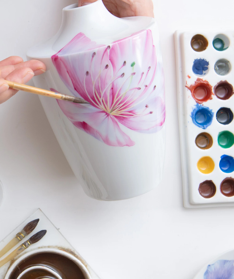 Für ihr Erinnerungsstück entschied sich Stephanie für ein Motiv, das sie bereits seit der Zeichenschule begleitete: asiatische Szenarien. Inspiriert durch das Kopieren fernöstlicher Holzschnitte entwickelte sie eine besondere Leidenschaft für diese Ästhetik. Mit feinem Pinselstrich und viel Sinn für Komposition übertrug sie diesen Stil auf Porzellan - figürlich, detailverliebt und mit beeindruckender Präzision. Eine Arbeit, die nicht nur ihr Können, sondern auch ihre gestalterische Entwicklung während der Ausbildung widerspiegelt.