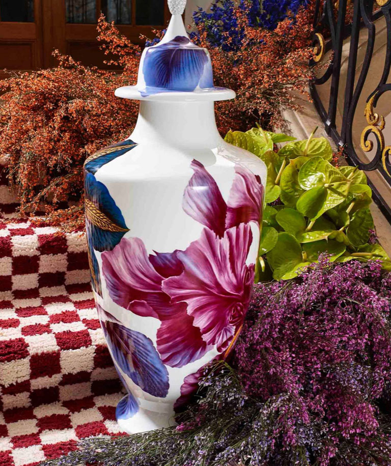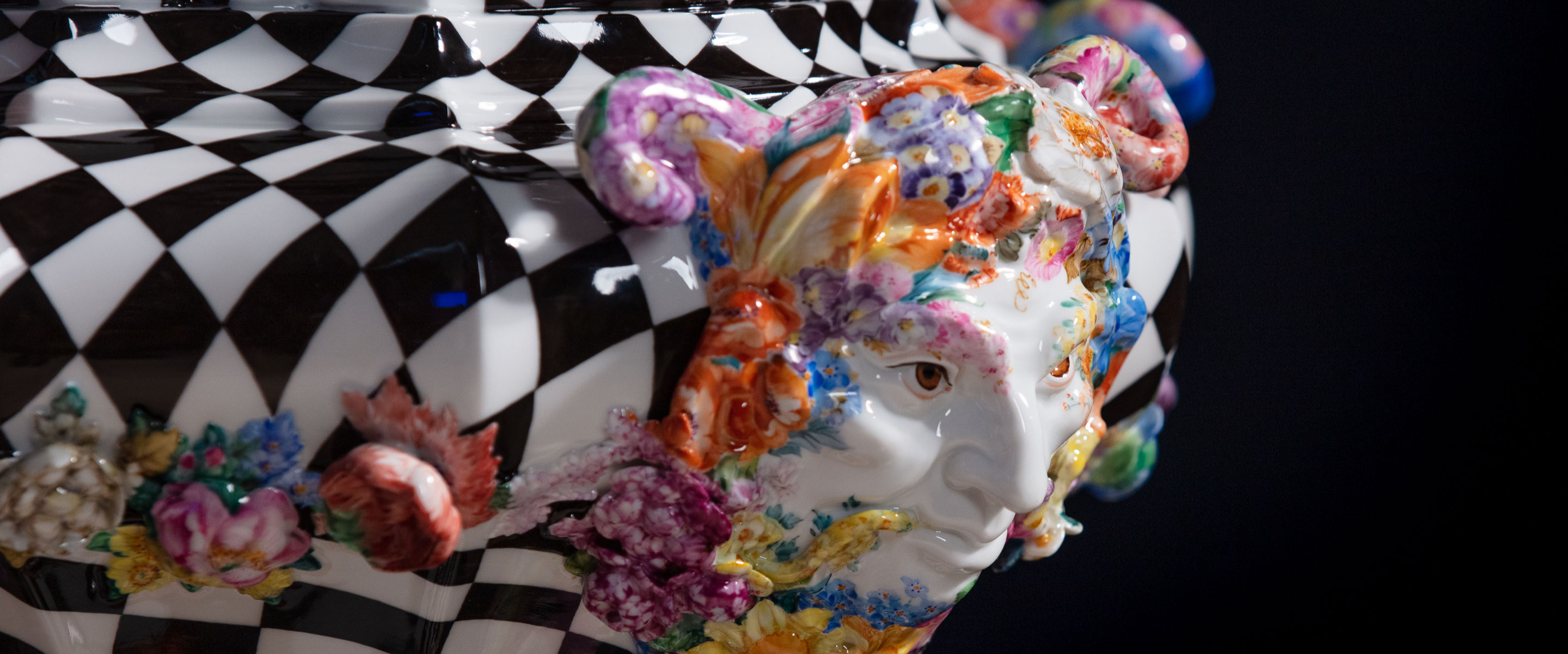 Als wahre Meisterleistung der Bossierkunst beeindruckt die prachtvolle Vasenform nun mit plastischen Blumenranken, weibliche Hermen und Maskarons zieren die Henkel. Der historische Vasenkörper wird durch die dynamische Gestaltung spannungsvoll umschmeichelt. Zwei gegensätzliche Gestaltungsprinzipien stoßen dabei aufeinander: das Schachbrettmotiv und farbenfrohe Blumenranken als leuchtendes Camouflage-Muster. Die Blumen scheinen grenzenlos und ignorieren ganz bewusst die plastischen Reliefs, um einen surrealen sowie lebendigen Ausdruck zu kreieren. Es ist eine hohe Kunst, plastische Elemente so meisterlich zu verhüllen und der Form ganz bewusst nicht zu folgen.