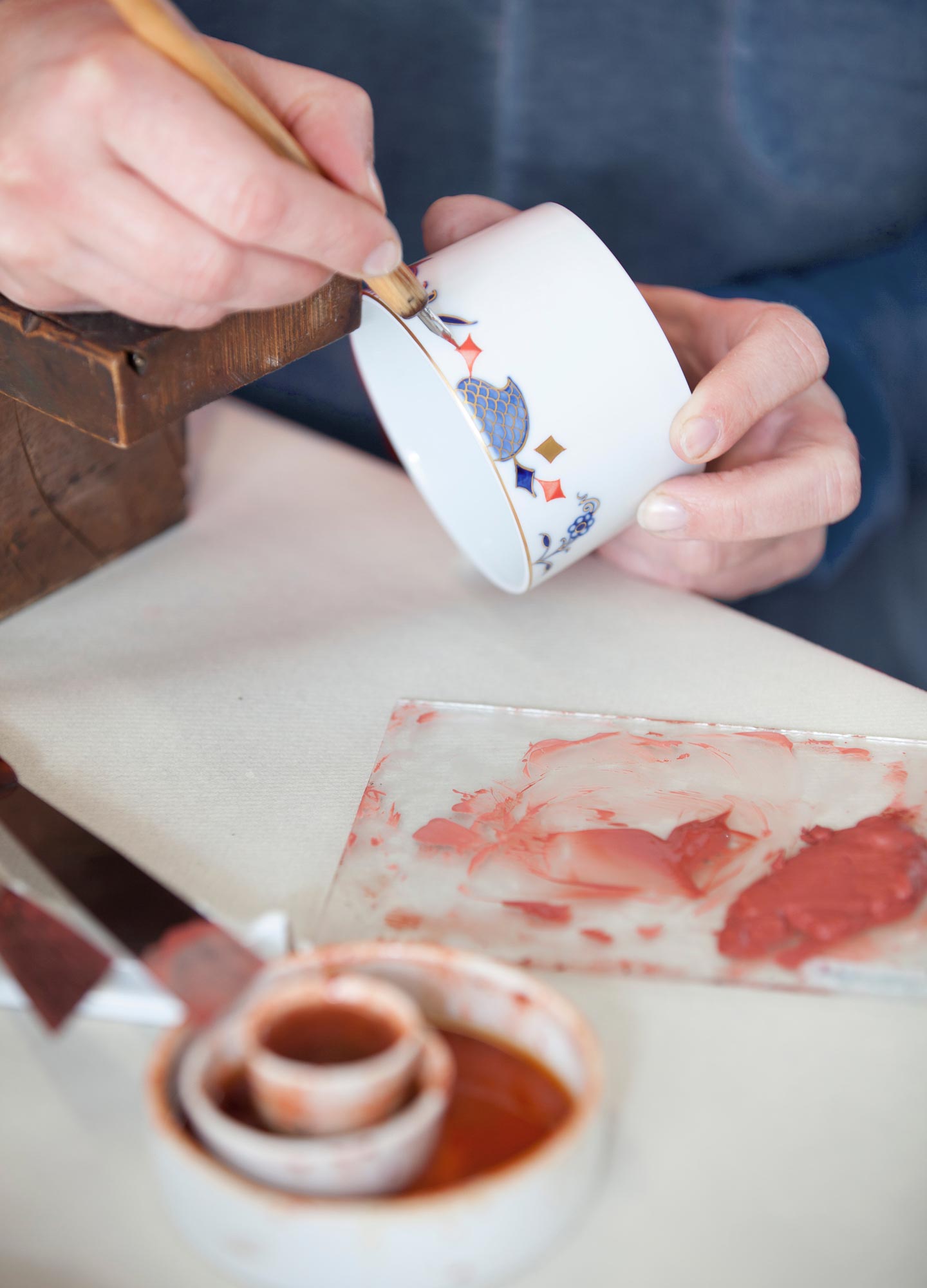 Zwei spezielle Techniken der Porzellanmalerei kommen bei der Entstehung des "Noble Blue" Dekors zur Anwendung, die nach höchster Präzision und Sorgfalt verlangen. Zunächst wird in der Unterglasurmalerei von Hand die manufaktureigene kobaltblaue Farbe mit feinen Pinselstrichen auf das unglasierte Porzellan aufgetragen. Der noch poröse Scherben saugt die Farbe sofort auf, sodass Korrekturen unmöglich werden. Der Dekor erscheint nun in einem matten Grau. Erst nach dem Glasieren und dem darauffolgenden Glasurbrand erstrahlt das Blau. Spezielle Inglasurfarben kommen für die anschließende Veredelung mit Rot und Gold zum Einsatz. Mit einer Stahlfeder von Hand aufgebracht, sinken diese Farben beim erneuten Dekorbrand leicht in die Glasur ein und werden so durch diese geschützt. Eine abschließende Politur lässt die Golddekoration erstrahlen.