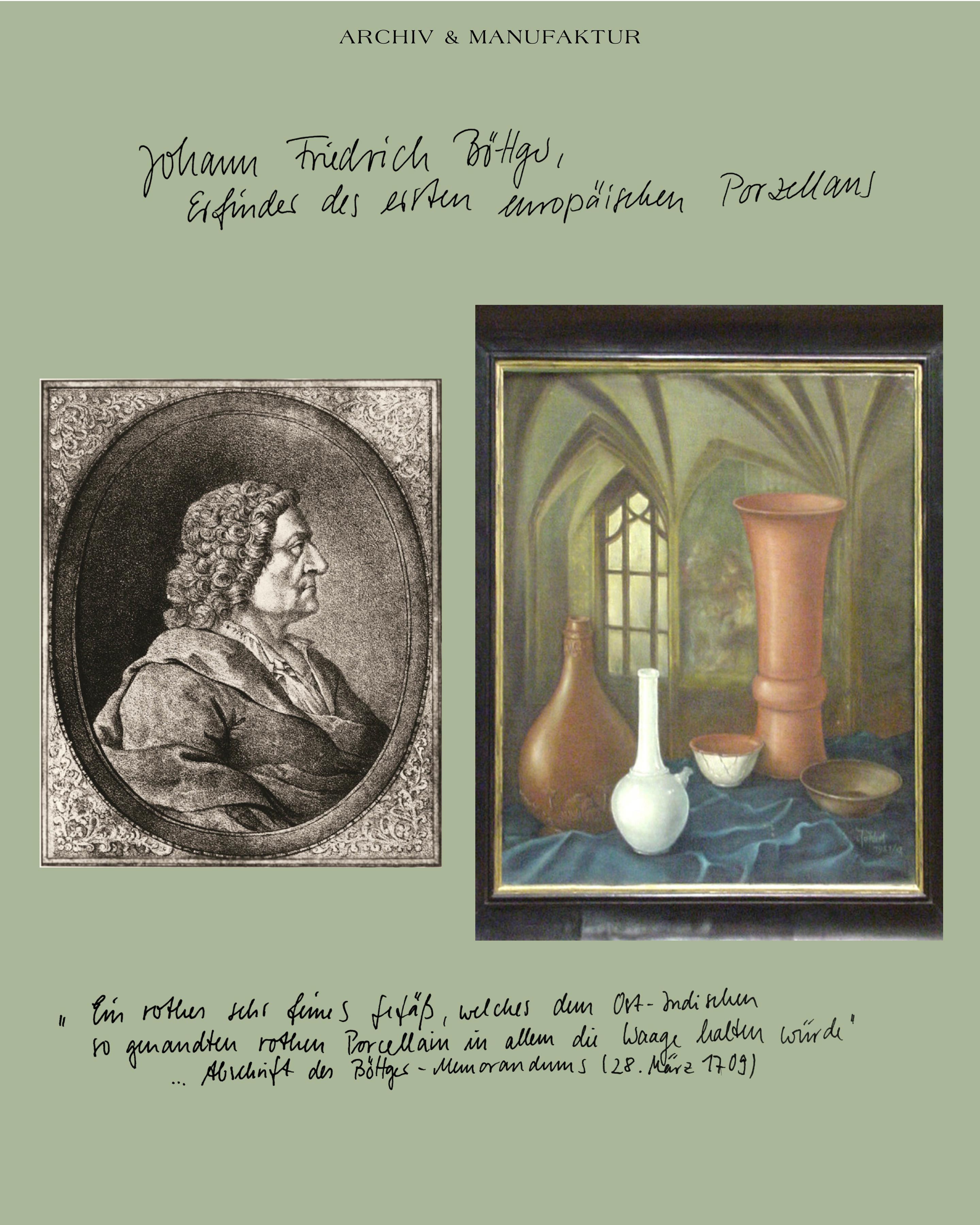 Johann Friedrich BöttgerJohann Friedrich Böttger zählt zu den wichtigsten Wegbereitern des europäischen Porzellans und der Gründung der Manufaktur Meissen. Als junger Alchemist wird Böttger 1702 von August dem Starken nach Dresden bestellt, da er sich damit rühmt, Gold herstellen zu können. Nach Jahren systematischen Forschens gelingt ihm zwar nicht der ersehnte Stein der Weisen. Doch mit der Entdeckung des „Böttgersteinzeugs“ wird in Europa zum ersten Mal das Herstellungsprinzip chinesischen Porzellans gefunden und angewandt: Tone werden mit Quarzen und einem Flussmittel gemischt und bei sehr hohen Temperaturen gebrannt. Nur wenige Jahre später gelingt auch die Herstellung des weißen Hartporzellans, dessen erste Rezeptur seither im Archiv der Manufaktur verwahrt wird. Noch hallt Böttgers Schaffen nicht nur in der Porzellanmanufaktur Meissen nach, deren erster Leiter er wurde, sondern auch in der Rede vom „Weißen Gold“.