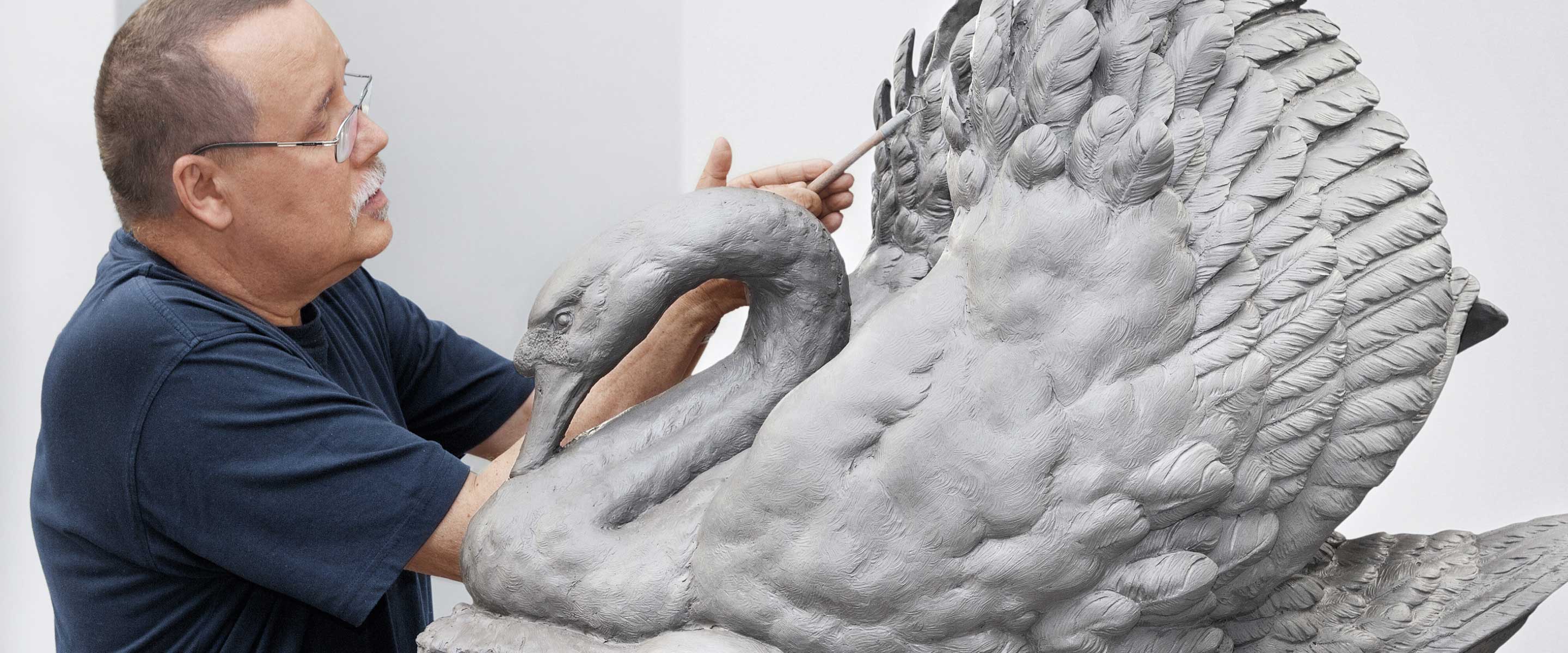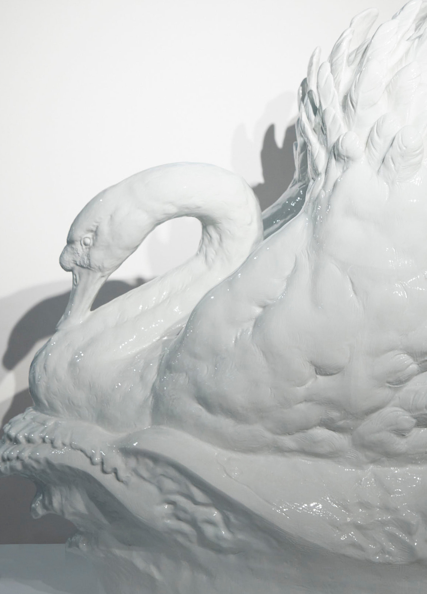 Anlässlich des 275. Jubiläums des Kaendler‘schen „Schwanenservice“ wird die Großplastik eines Schwans im Jahr 2012 vom ehemaligen Meissener Chefplastiker Jörg Danielczyk modelliert. Die Skulptur verweist in ihrer geschwungenen Formensprache des Barocks auch auf das zweite große Erbe Kaendlers – die berühmten Großtierplastiken für das Japanische Palais in Dresden. Wie sie ist der Schwan bewusst weiß belassen, um die Bildsamkeit des Porzellans zur Geltung zu bringen. Meisterhafte Akzentuierungen zeigen sich in der detailreichen Modellage des Gefieders. Die Herstellung einer solchen Großplastik stellt die Meissener Bossierer heute vor die gleichen Herausforderungen wie im 18. Jahrhundert: Das Innere der Figur wird mit Kammern ausgestattet, die als architektonisches Grundgerüst dienen. Sie müssen die Form erhalten, wenn das Porzellan im Hochofen zunächst weich wird. Eine Assemblage, die jahrelanger Erfahrung bedarf.
