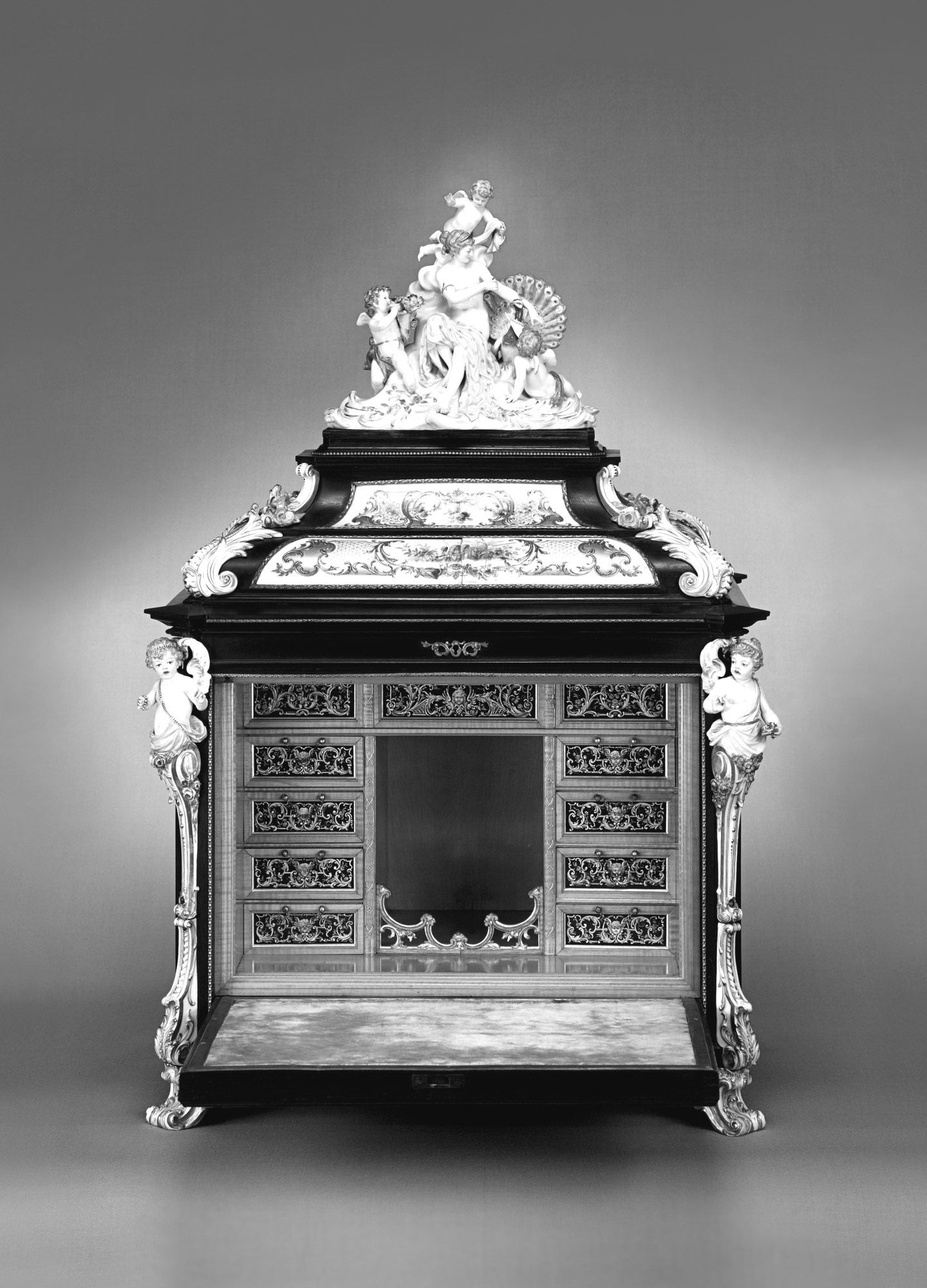 1893 wird die „Schmucktruhe“ der Manufaktur Meissen erstmals auf der Weltausstellung in Chicago präsentiert. Nach einem Entwurf von Ludwig Sturm realisiert, verbindet sie historische Techniken der Porzellangestaltung mit edlen Werkstoffen und klassischen Motiven. In Edelholz und Bronze eingefasste Porzellanplatten zu jeder Seite zeigen transluzente Pâte-sur-pâte-Dekore – feinste Schlickermalereien, für die bis zu 30 Schichten flüssige Porzellanmasse mit dem Pinsel aufgetragen und zu einem Relief beschnitten und ziseliert werden. Die aufwendige Technik musste – eigens für die limitierte Neuauflage – von Meissener Porzellanmalern wiedererlernt werden, um die anspruchsvollen antikisierenden Malereien originalgetreu fertigen zu können. Anmutig bekrönende Figur der Truhe ist die römische Göttin Juno, als Sinnbild der Liebe und Schönheit begleitet von ihrem Weihetier dem Pfau.