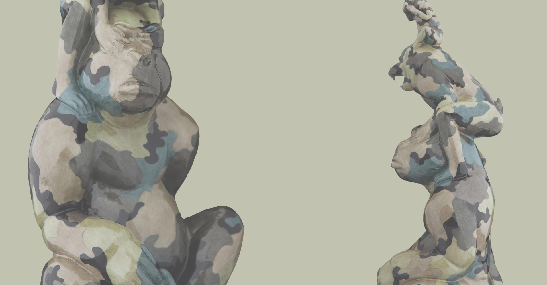 With her interpretation of the Three Wise Monkeys, Maria Walther has created an expressive depiction in the tradition of Meissen animal statuary. With no naturalistic template, the detailed camouflage pattern – a nod to the sculptures “see no”-symbolism – requires the utmost in abstract thinking.