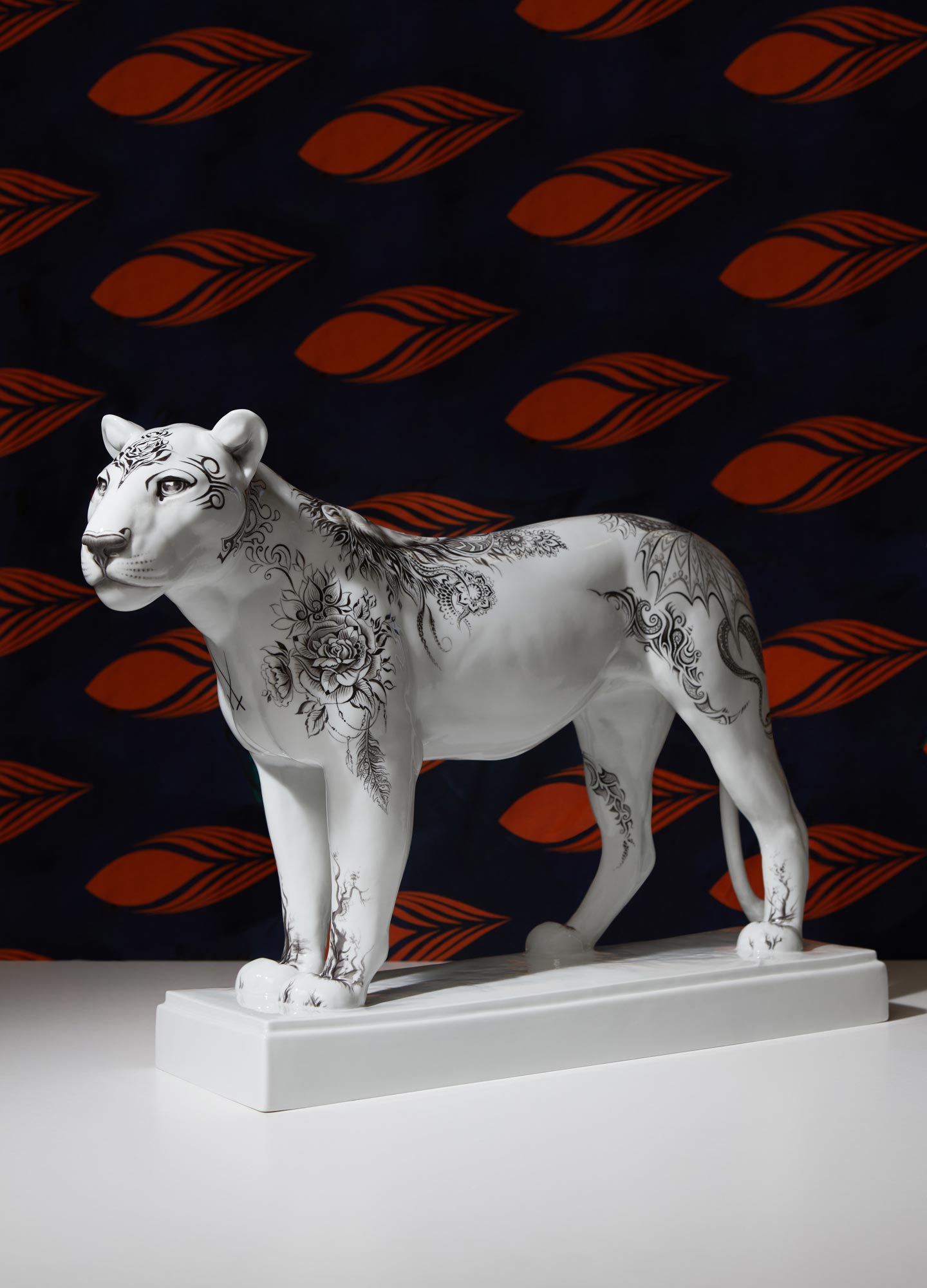 Tattoo LionessFor “Tattoo Lioness”, Otto Drögsler created a complex design out of manifold graphic tattoos that, in his hand, become reminiscent of monochrome porcelain painting. The pattern is applied to different portions of the historic 1922 sculpture of a lion by August Gaul similar to a collage, thus reinforcing the figure’s majestic presence. The detailed tattoo motifs and their lavish application demand the ultimate precision and expert craftsmanship on the part of Meissen’s porcelain painters. -