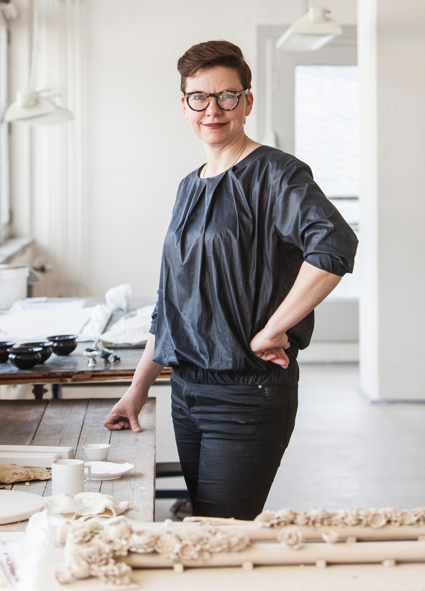 After initially painting porcelain, the American artist Jen Ray (b. 1970) began creating porcelain sculptures inspired by an object of everyday use: with her “Axe Series”, Ray makes a statement about the history of the manufactory’s porcelain pieces as well as about the modern design of axes and the power they exude, marrying something tough and utilitarian with something luscious and organic. Ray’s axes are covered in her own designs as well as, in one variant, with handmade porcelain flowers. These delicate flowers refer to the transient nature of things – a topic that plays a central role in many of Ray’s works. With her large-format drawings, sculptures and video and performance installations, Jen Ray creates a world where Amazonian militants march across dystopian landscapes, fantasy spaces are occupied by rebels, and provocateurs pose in resplendent decadence.