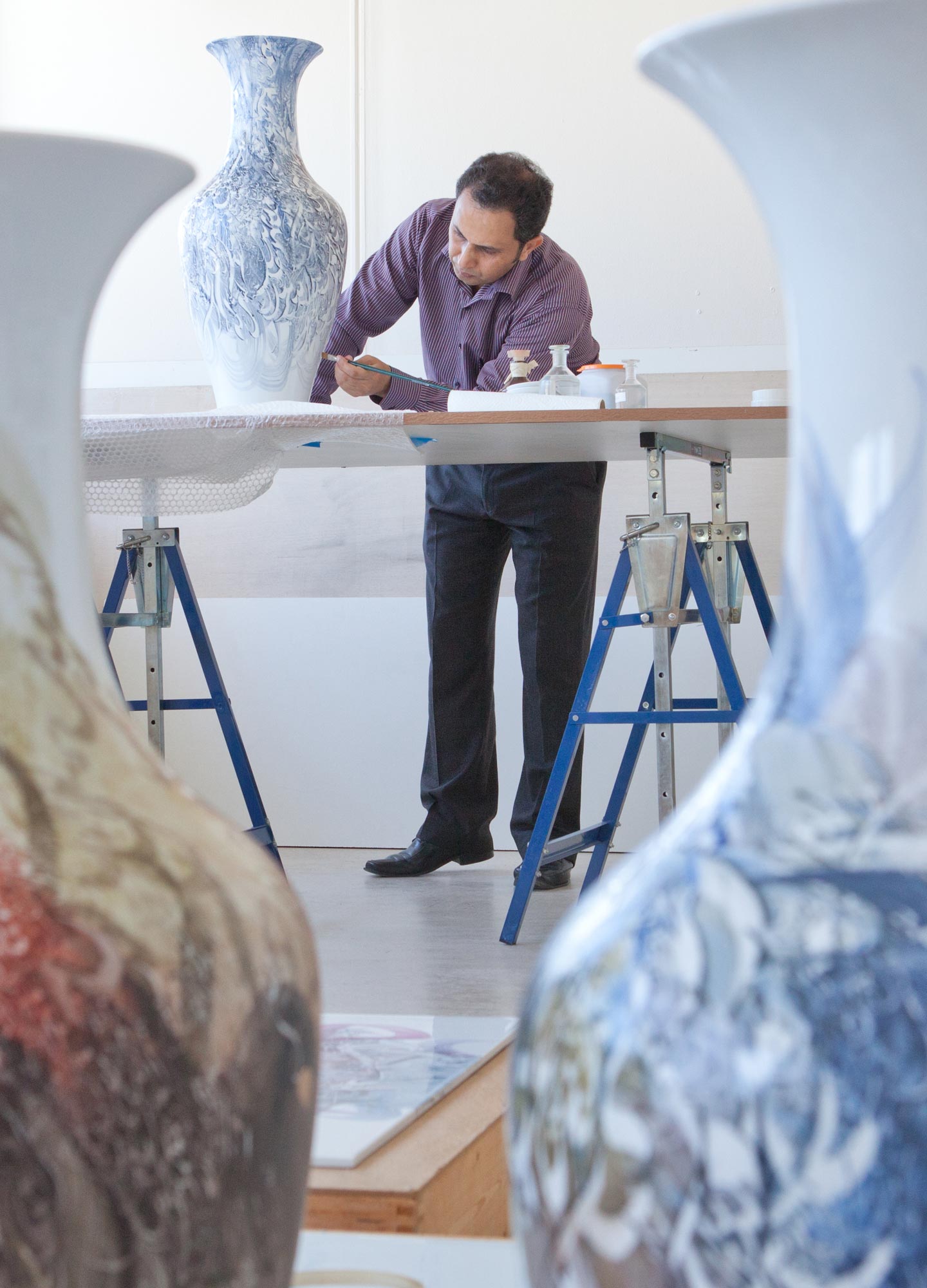 Khaleed Al-Saai (b. 1970) arranges letters and words out of context, dissociated from one another, or squished together in imaginary spaces on canvas. The interwoven letters and scripts move with their own unique rhythms and allow highly individualised worlds of emotions to emerge. In his works the Syrian artist tests the limits of Arabic script, explores single letters, their shapes, their symbolic, religious, and musical histories, and turns these letters themselves into abstract symbols. Khaleed Al-Saai is considered one of the best calligraphers in the world. For him, Arabic script is a medium with which he can express his feelings and thoughts without being restricted by language. For MEISSEN, he has brought his art to the medium of porcelain to create Unique Objects.