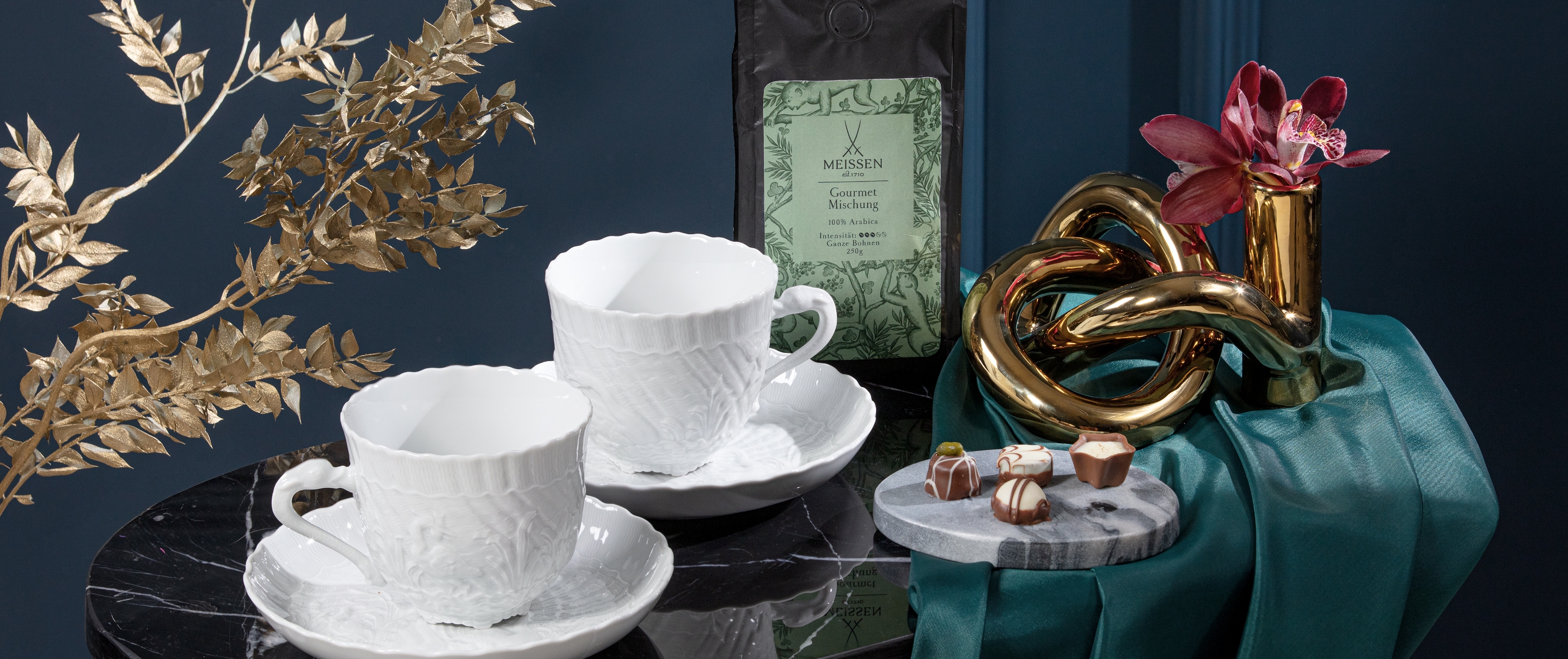 Around the origin of coffee there are many myths that go back to 900 AD. The term "coffee" is derived from the Arabic word "Kahwe" or "Qahwa", which means life force or strength. The place of origin of Arabica coffee is in Ethiopia. This type of coffee is also the most widespread and reached Europe over Arabia in the 16th century. The myth that coffee served in porcelain cups tastes best probably dates precisely from this period. When the first European porcelain was invented in 1708, not only did the coveted Meissen porcelain enter the royal houses, but coffee culture became increasingly popular. However, coffee, like the famous Meissen porcelain, was an absolute luxury good and remained the preserve of high society. The enjoyment of the noble, aromatic black beverage in handmade pure white porcelain cups was therefore an exclusive speciality and the epitome of fine taste.