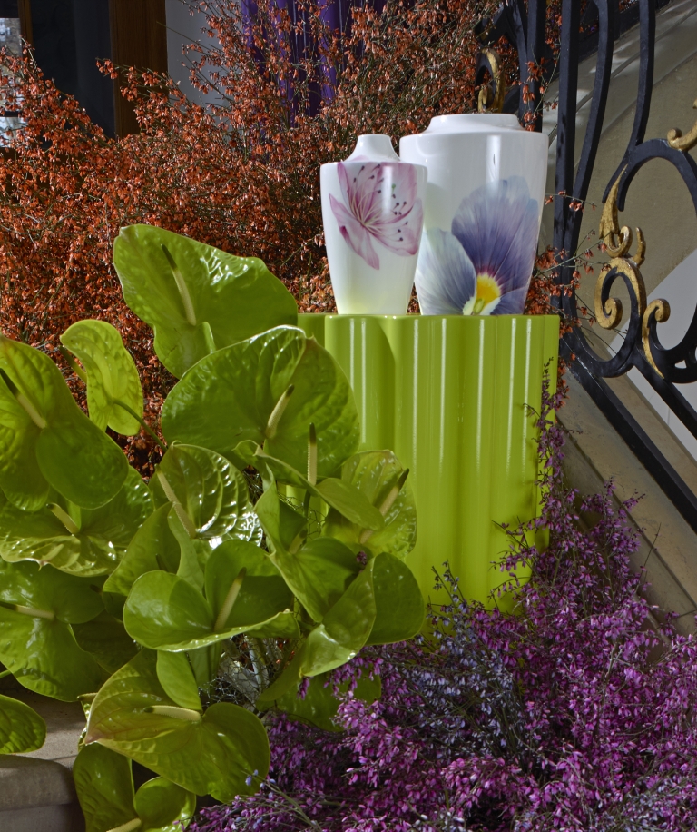 Full of symbolic power, the world-famous Ming Dragon shines in luminous purple on a wide variety of porcelains and has a magical effect as a symbol of light, supernatural wisdom and the spirit of change. The proud phoenix, which adorns the new mug and the Vide-Poche “Phoenix”, is also the subject of legends that tell of immortality or resurrection. Indian Flower Painting fascinates with intense colours and stylised motifs that express something mysterious and invite us to learn more about this enchanted world of flowers.