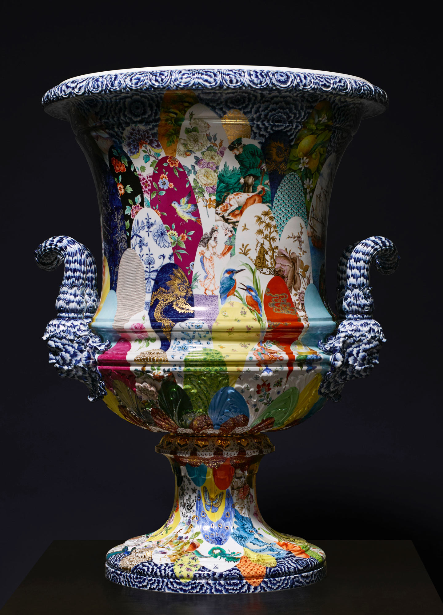 “A lavishly embellished vase with over 100 motifs applied by 27 specialised painters in various techniques. Luters are presented with their very own challenge: the vase's wet mass weighs against its own shape.”