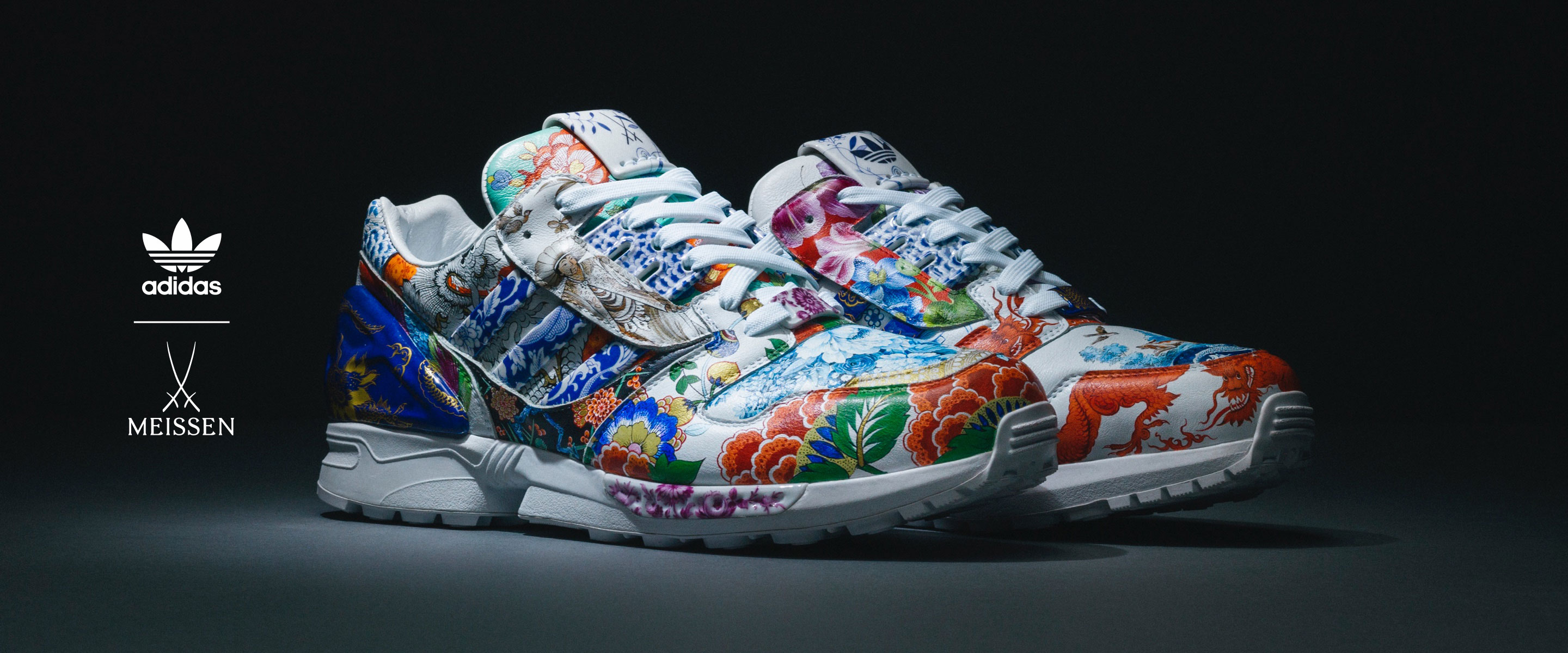 At the heart of this unique collaboration is a harmonic coalescence of two icons; the Meissen Krater Vase and the adidas Originals ZX8000 silhouette. First designed in 1856, today and for the very first time, the Krater Vase unites a number of decorative styles and techniques from throughout the manufacturer’s 310 year history. Paying homage to this quintessential piece of Meissen design, adidas’ own modern icon, the ZX8000 shoe model, is adorned with 15 of the Vase’s 130 different patterns. Ensuring the pair’s unique place in history, each pattern has been painstakingly crafted with the utmost care and precision by four individual painters across three separate Meissen departments. A testament to craftsmanship, art, and unbound creativity, this silhouette is unmatched in its elegance.