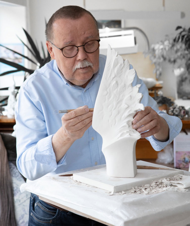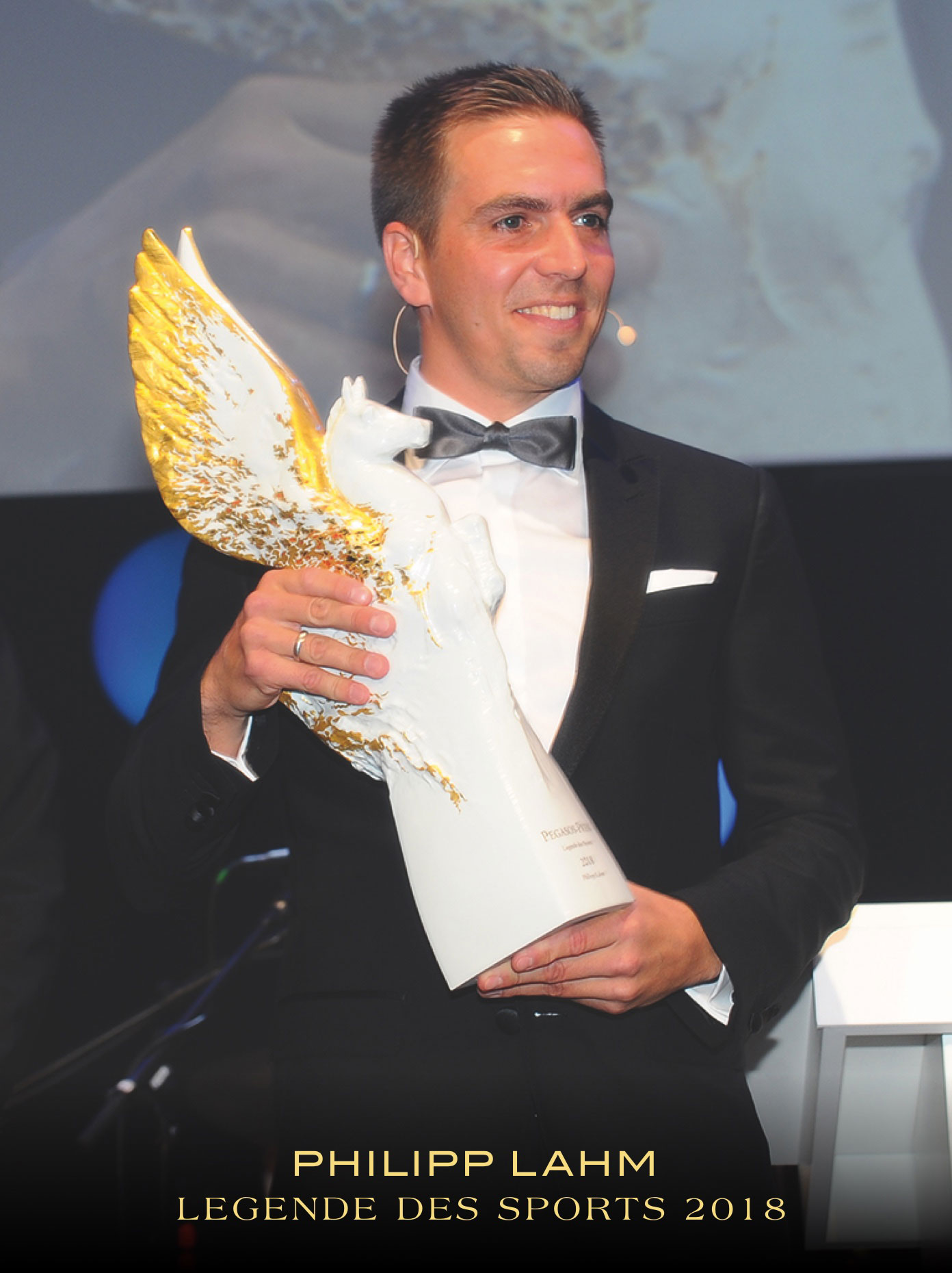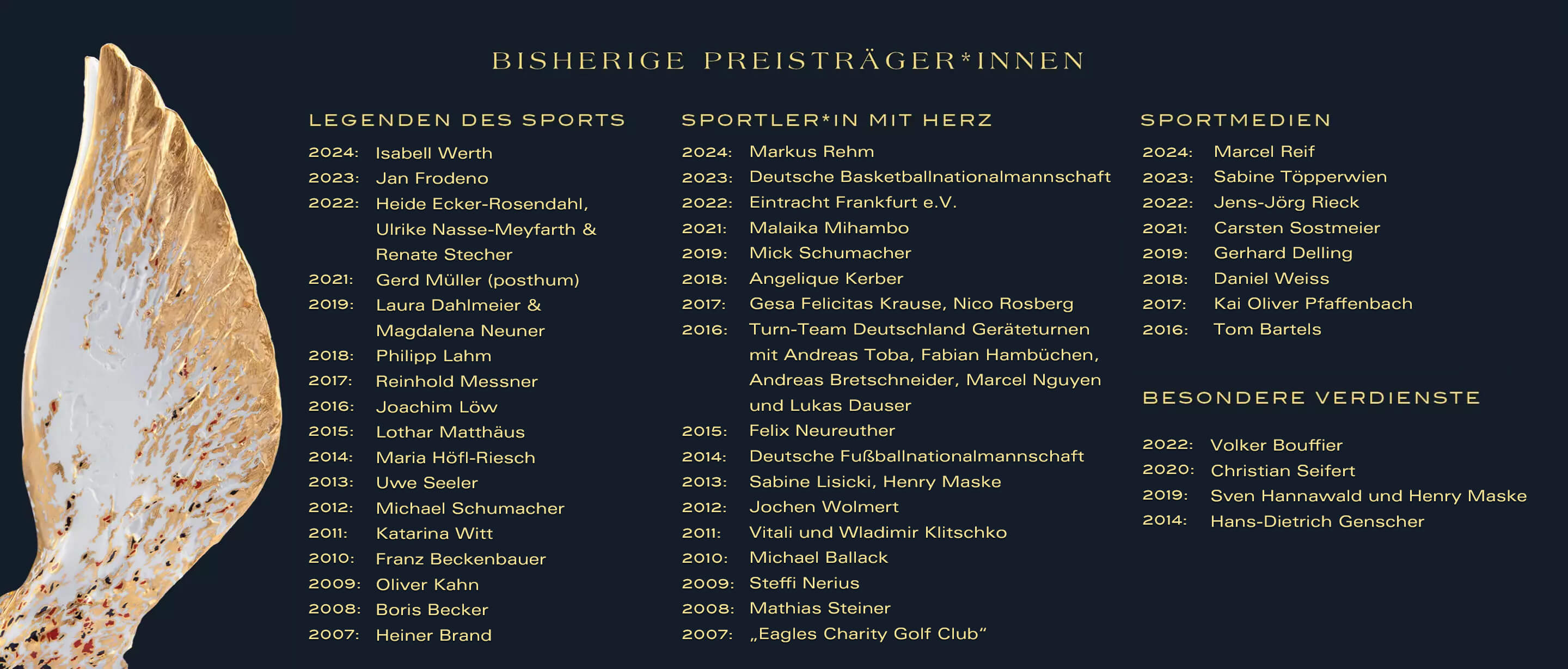 The trophy itself was created exclusively for the German Sports Press Ball by the former chief sculptor of the MEISSEN porcelain manufactory, Jörg Danielczyk (*1952). The eye-catchers of the PEGASOS are the oversized wings, which give the impression that the magnificent horse wants to soar into the sky with the next beat of its wings. This impression is underlined by the golden painting of the wings, which is complemented by discreet black and red brushstrokes - a gentle, almost fleeting reference to the national identity of the prize.