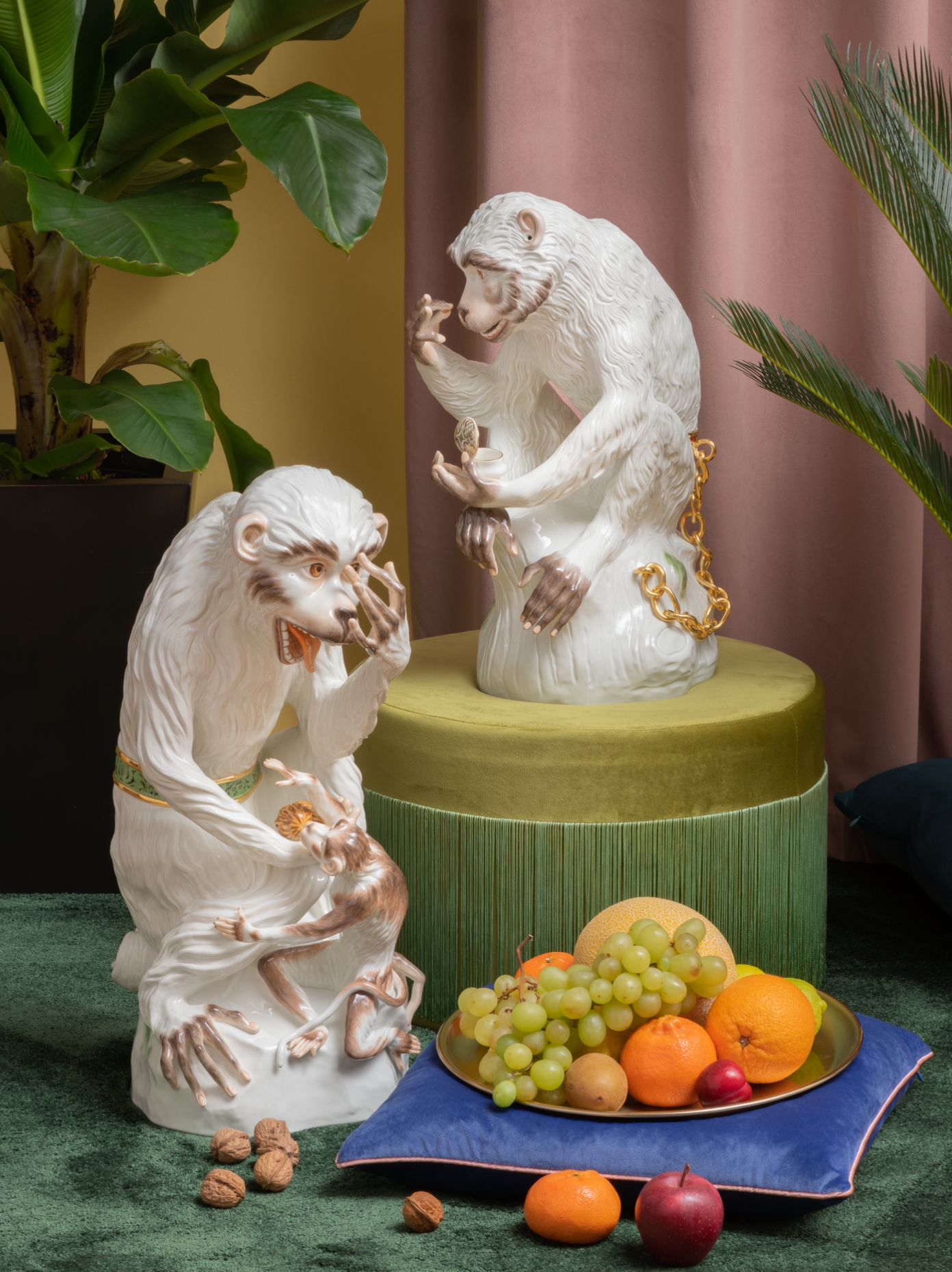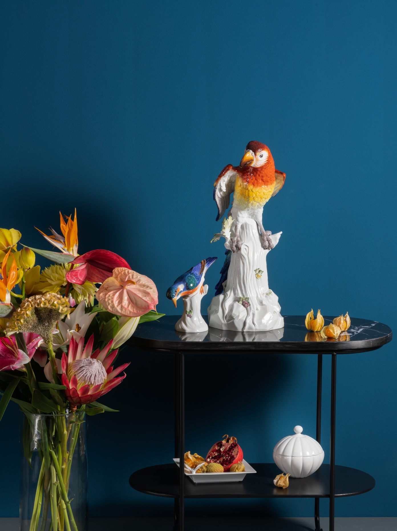 • The magnificent rooms in Southeast Asian style are different, guaranteeing a wow effect with symmetrical design, a bold colour scheme, colourful orchids and magnificent porcelain vases. If the journey is to take us to the tropics, it is brilliant colours, exotic animal and plant motifs as well as opulent precious metal accents that we encounter - pineapple tins and leaf bowls as well as hand-painted parrots, leopards and monkeys that find skilful expression in Meissen porcelain.