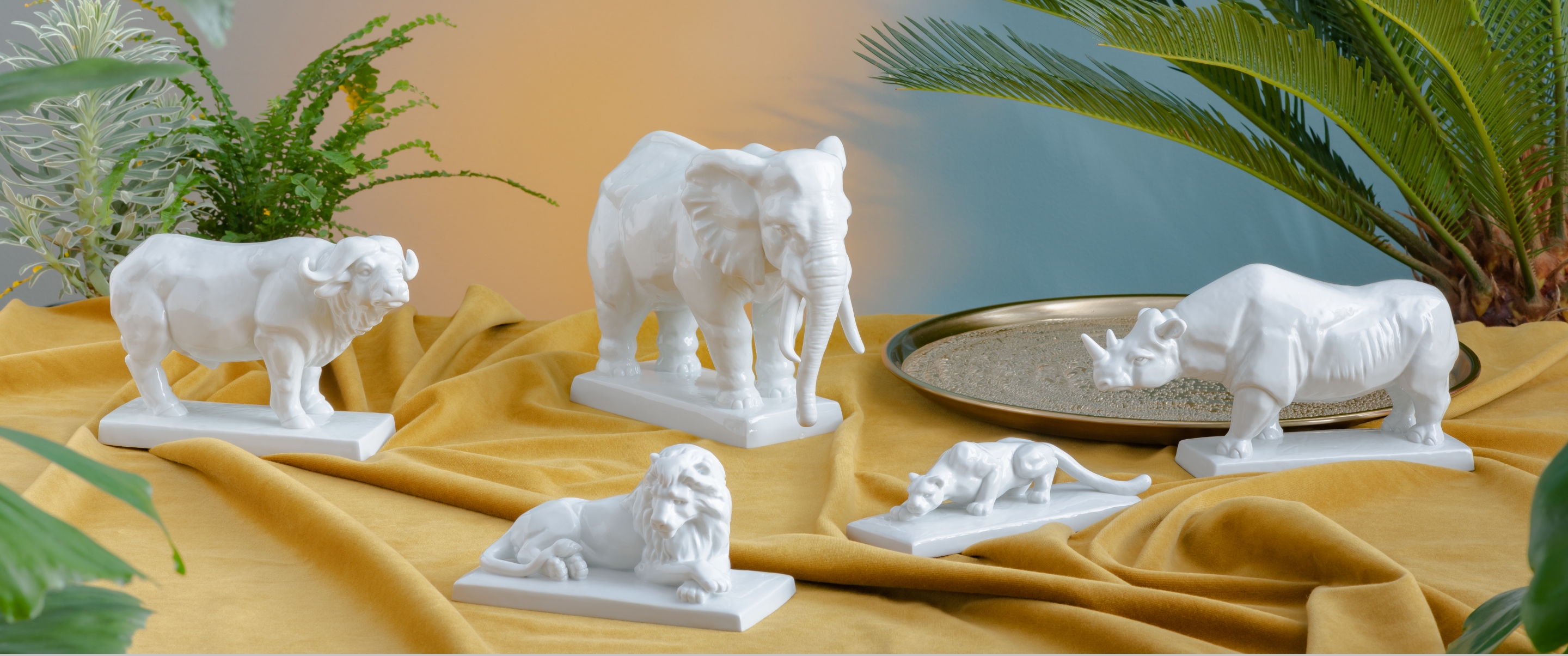 The "Big Five" by Maximilian Hagstotz show the eponymous "Big Five" - buffalo, lion, elephant, leopard and rhinoceros - as a unified group of figurines for the first time and also in the characteristic carving style inspired by African wooden sculptures. A graphic decor, inspired by traditional African patterns, gives the porcelain a graphic contrast and the figurines a fascinating symbolic power. With the "Animals from Africa" series of murals, Meissen porcelain painter Detlef Ritter created a pictorial homage to the continent and developed a detailed, expressive style that catches the eye and lets it wander over the mural. A statement piece that becomes an eye-catcher in any room. Wherever the design journey of our interiors takes us, with MEISSEN every interior shines in the splendour of modern opulence.
