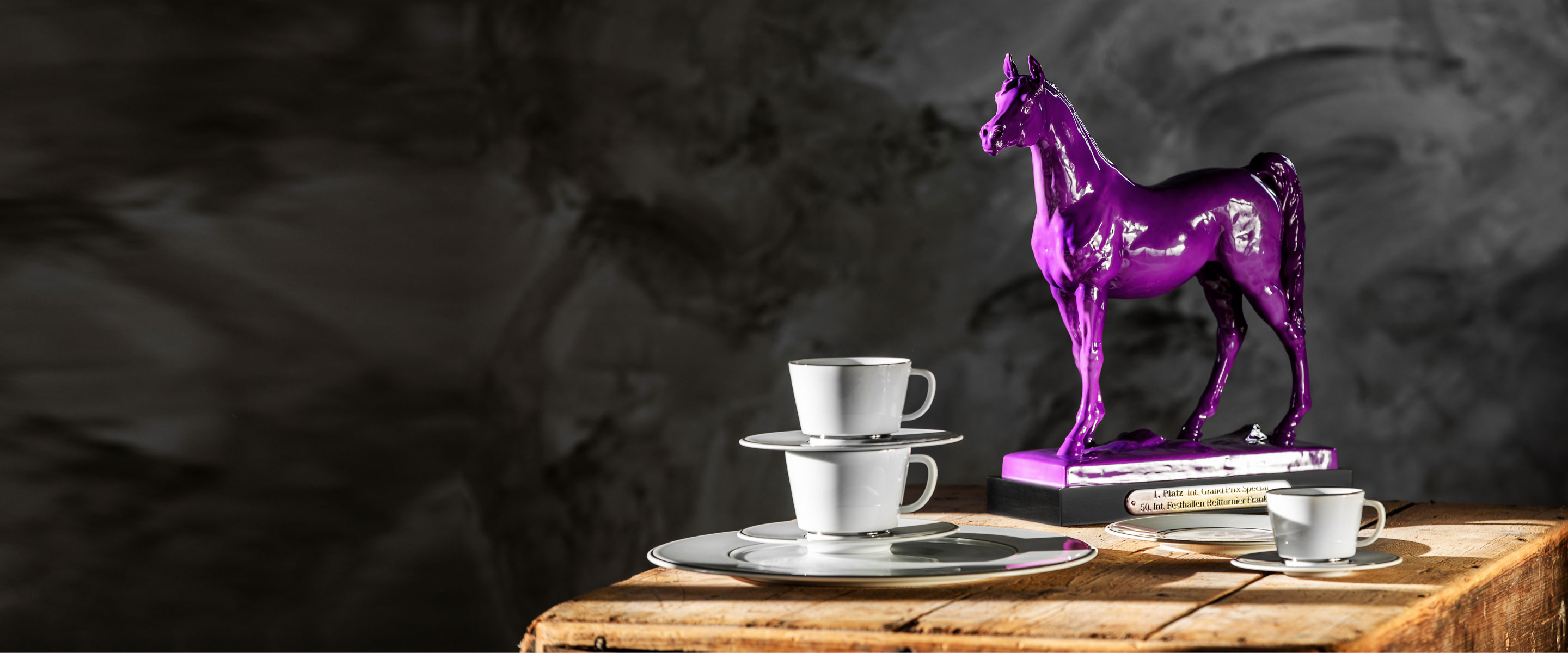 Since 2023, MEISSEN has been providing unique honorary prizes for the winners of the individual disciplines. The champions of the so-called “Youngster Tour”, the “Grand Prix Special” and the “Winning Round” will each receive one of three fine porcelain Arabian stallions by MEISSEN artist Jörg Danielczyk in unmistakable “Frankfurt purple”. In addition, the winner of the “Jump & Drive” special event will be presented with the “Horse Grande” figurine with a very special painting in the style of a finish line flag as a trophy. In this way, the tradition of the renowned tournament, which revolves around the passion of equestrian sport, meets the tradition and passionate craftsmanship of our porcelain manufactory.