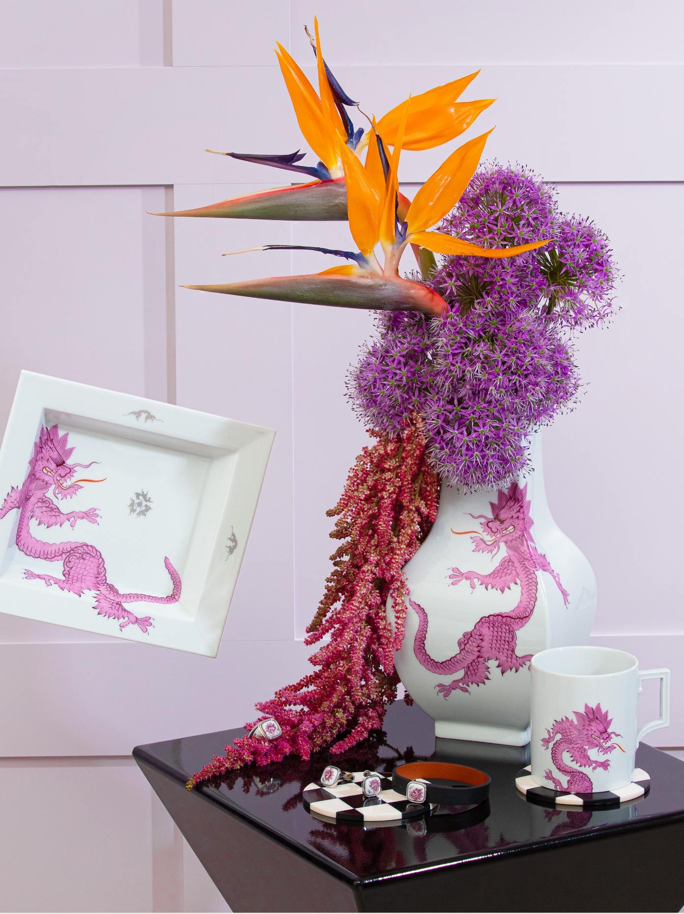 The decor complements Meissen creations such as the iconic "Ming Dragon", one of the manufactory's most iconic décors, which adorns a wide variety of porcelains in luminous purple and tells of supernatural wisdom, the spirit of change and of becoming. The representation of the dragon with four claws, typical of MEISSEN, was reserved only for the imperial prince in ancient China. It is intended to give you free rein to let your imagination run wild and invites you to go on a journey of discovery.
