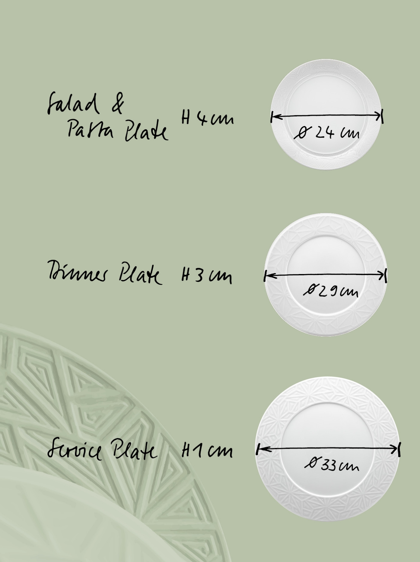 A highlight of your decorated dinner table is the service plate. As the name suggests, it serves as a placeholder for the plate with the food of the particular course. With a diameter of 33 cm, our flat "VITRUV" service plate is specially designed for this purpose and is a wonderful decorative element for your table. Its purist design on the rim of the plate with a relief of geometric shapes and columns spreads a distinguished, noble atmosphere. The porcelains that are positioned on the service plate are exactly matched to it in design and size, so that the guest always sees a wonderful ensemble in front of him. This is why the service plate remains in place until the end of the dinner and also protects the tablecloth from unwanted stains.