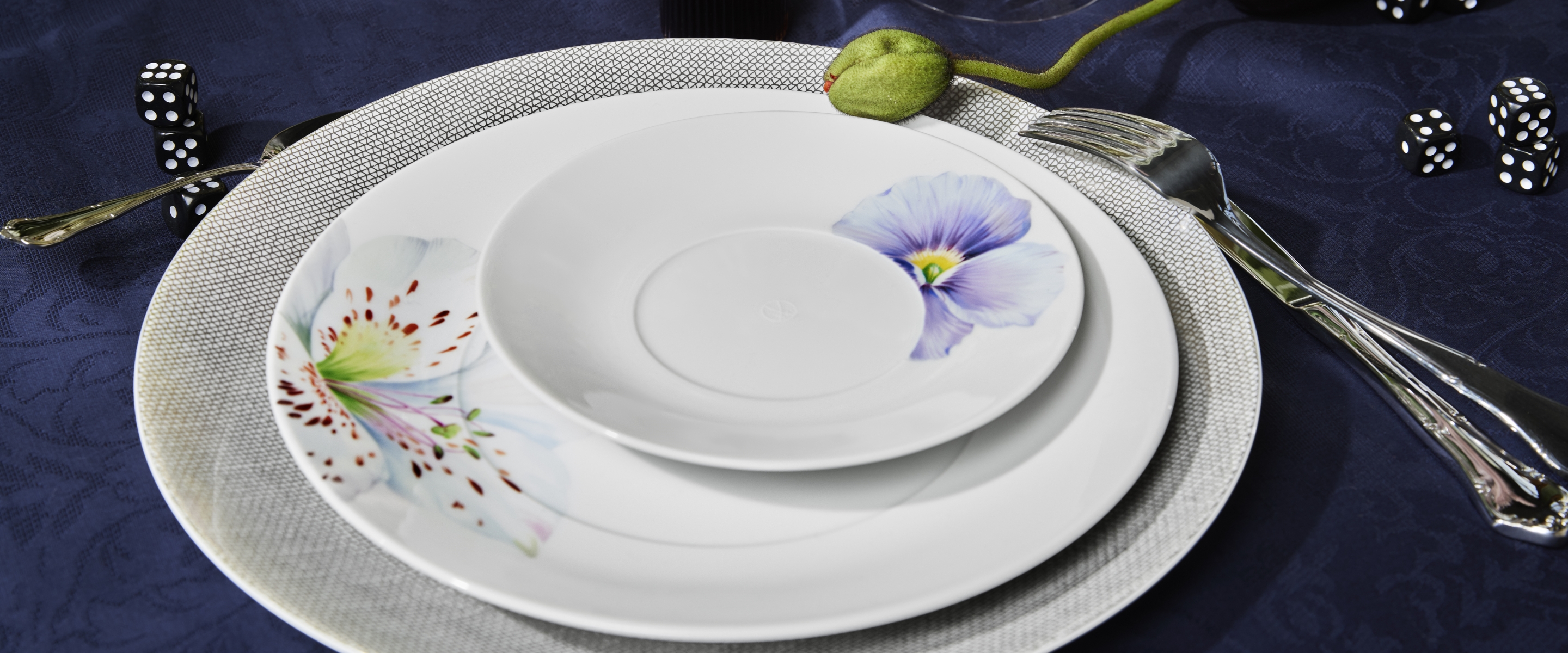 But traditional floral painting was not the only genre to be given a new lease of life and brought into the here and now. Two other contemporary interpretations this year were the cobalt blue painting of the world-famous "Onion Pattern" and the sweeping waves of our popular "Waves" collection, which were reinterpreted on the modern "N°41" shape.
